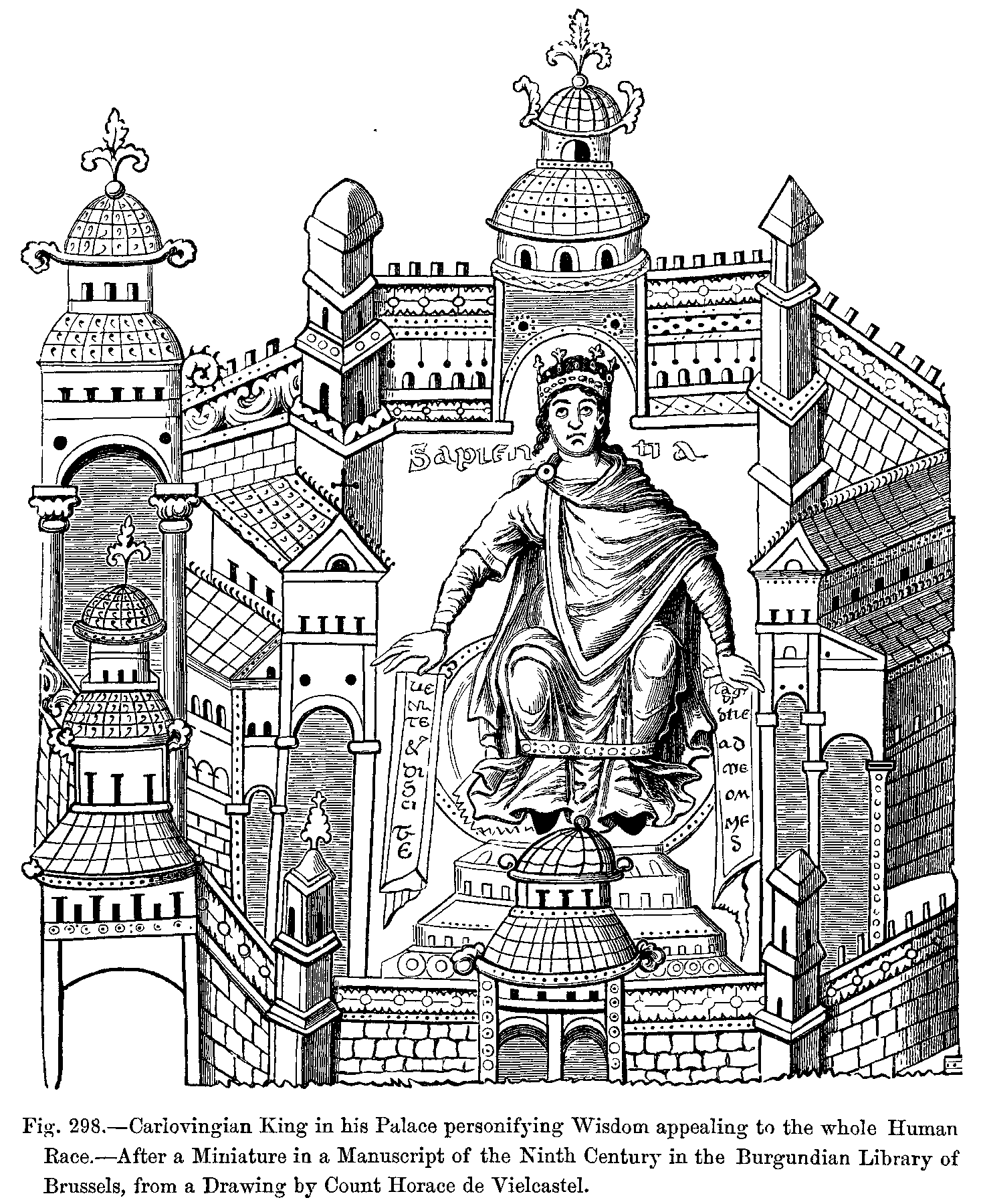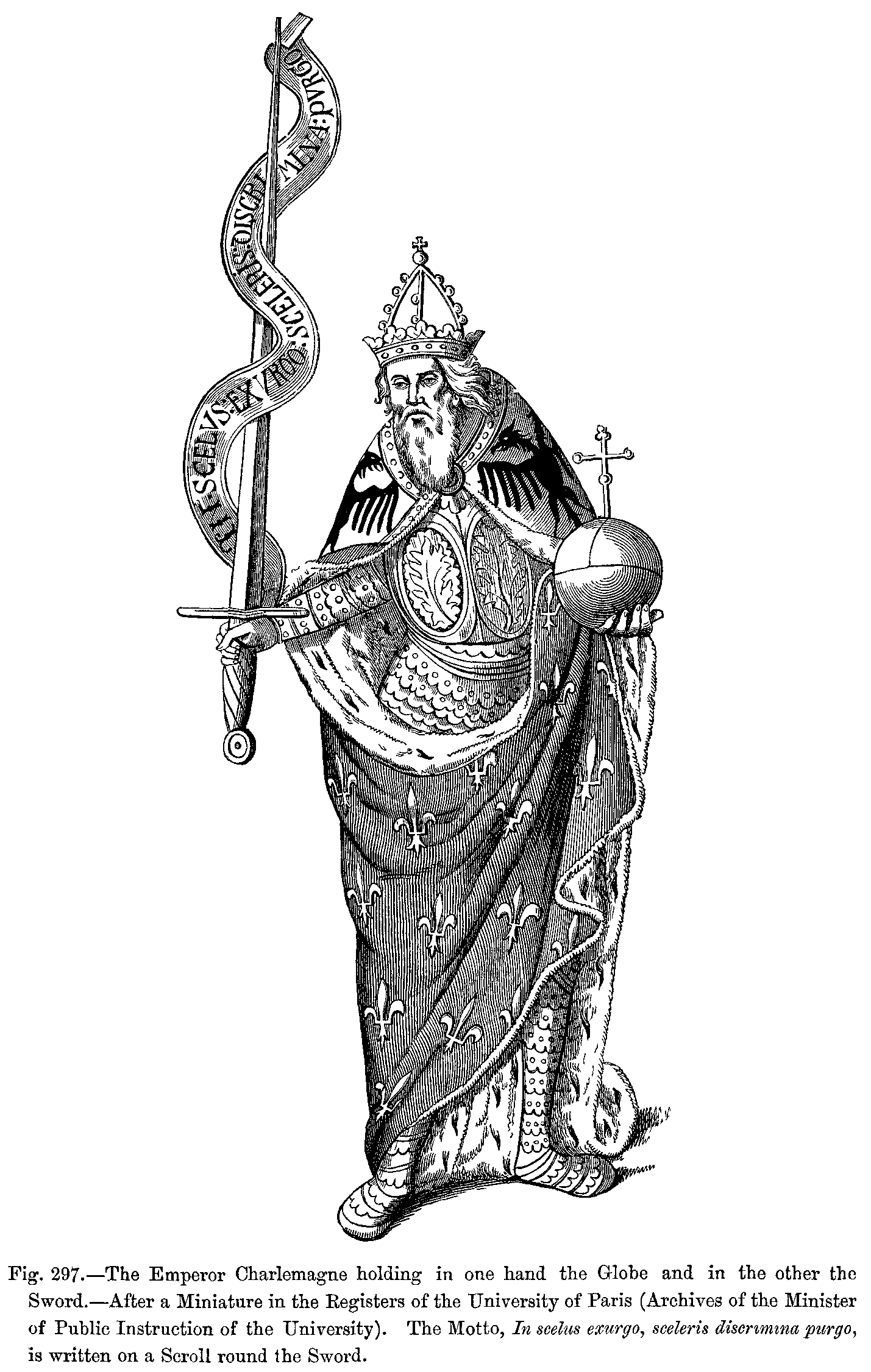 Charlemagne was the first who recognised that social union, so admirable an example of which was furnished by Roman organization, and who was able, with the very elements of confusion and disorder to which he succeeded, to unite, direct, and consolidate diverging and opposite forces, to establish and regulate public administrations, to found and build towns, and to form and reconstruct almost a new world (Fig. 8). We hear of him assigning to each his place, creating for all a common interest, making of a crowd of small and scattered peoples a great and powerful nation; in a word, rekindling the beacon of ancient civilisation. When he died, after a most active and glorious reign of forty-five years, he left an immense empire in the most perfect state of peace (Fig. 9). But this magnificent inheritance was unfortunately destined to pass into unworthy or impotent hands, so that society soon fell back into anarchy and confusion. The nobles, in their turn invested with power, were continually at war, and gradually weakened the royal authority--the power of the kingdom--by their endless disputes with the Crown and with one another.