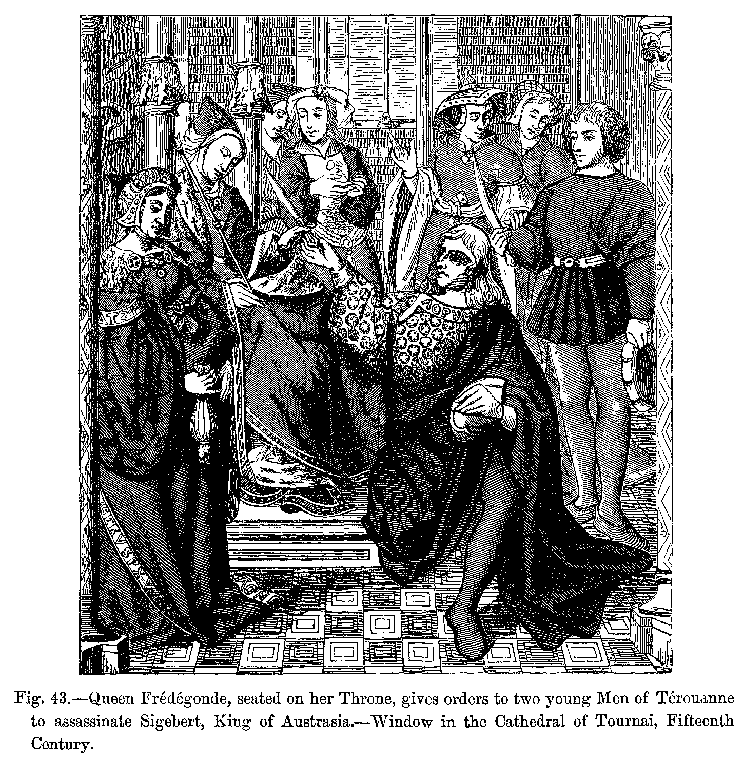 1. The Queen of Sheba before Solomon. Fac-simile of a Miniature from the Breviary of Cardinal Grimani, attributed to Memling. Costumes of the Fifteenth Century.