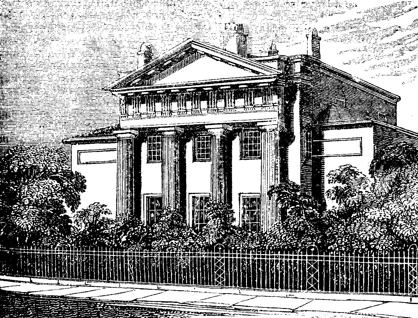 The second engraving is another specimen of the Regent's Park villa style. The order is handsome Doric; but much cannot be said in praise of its adaptation to a suburban residence. It nevertheless adds the charm of variety to the buildings that stud and encircle the park, and intermingle with lawns and bowery walks with more prettiness than rural character.