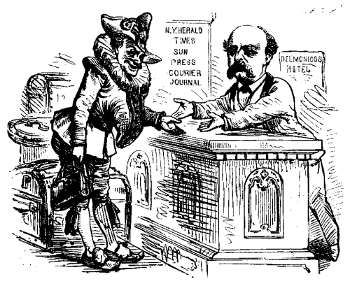 PUNCHINELLO, Vol. 1. No. 1. (Suggestion: "Take care of No. 1.") PUNCHINELLO TO THE PUBLIC, GREETING: His name, PUNCHINELLO hopes, will not be found a difficult one to articulate. He flatters himself that it has a smack of grape-juice and olives about it. It rhymes with "mellow," which naturally brings us to "good fellow.". On occasions PUNCHINELLO can "bellow," cut a "tremendous swell," O, and he never throws away a chance of pocketing the "yellow." He would like to rhyme with "swallow;" but alas! it can not, can not be. And yet, in spite of (or perhaps on account of) PUNCHINELLO'S mellifluous name, much cavil has been brought to bear upon him. (Prepare to receive cavilry.) Squadrons of well-meaning persons with speaking-trumpets marched to and fro before the sponsors of PUNCHINELLO, each roaring at them to stop such a name as that, and attend to his suggestion, and his only. One did not like PUNCHINELLO because it means a "little Punch," and he—the speaking-trumpeter—liked a great deal; and lo! while he spoke, he changed his trumpet for several horns. Then he was taken with a fit of herpetology in his boots, and sank to advise no more. Another—a fellow with an infinite fancy for buffo minstrelsy—was vociferous that PUNCHINELLO should be called "Tommy Dodd." The discussion upon this lasted for three months; but finally, "Tommy Dodd" was rejected on account of the superfluously aristocratic aroma that exhaled from the name. Four divisions of men with banners then came by, each division respectively composed of members of the waning families of Smith, Brown, Jones, and Robinson, and each division bawled and thundered that the name round which it rallied should be adopted instead of PUNCHINELLO, on pain of death. And thousands of others came with suggestions of a like sort; for which some of them wanted "stamps." And when they had all had their say, PUNCHINELLO was called PUNCHINELLO, and nothing else—a name by which he means to stand or fall. And now to business. PUNCHINELLO is not going to define his position here. He refrains from boring his readers with prolix gammon about his foreign and domestic relations. He will content himself (and readers, he hopes) by briefly mentioning that he has foreign and domestic relations in every part of the habitable globe, and that they each and all furnish him with correspondence of the most reliable and spicy character, regularly and for publication. Among his foreign relations he is happy to reckon M. MEISSONNIER, the celebrated French artist, to whom he is indebted for the original painting from which PUNCHINELLO, as he appears on his own title-page, is taken. A preface is not the place in which to enlarge upon topics of great humanitarian interest, political importance, or social progress. PUNCHINELLO will merely touch a few of such matters, then, and these with a light finger. (No allusion, here, to the "light-fingered gentry," for whom PUNCHINELLO keeps a large grape vine in pickle.) PUNCHINELLO observes the incipient tendency to return to specie payments. To this revival, however, he is not as yet prepared to give his adhesion, though, on the whole, he considers it preferable to relapsing fever, which is also noted on 'Change. Cuba shall have her due share of attention from him. And if She-Cuba, (Queen of the Antilles, you know,) why not also He-Cuba?—lovely and preposterous woman, who, from her eagerness to slip on certain habiliments that are masculine, but shall here be nameless, shall henceforth be appropriately distinguished by that name. Let other important topics take care of themselves. PUNCHINELLO will only add that he would at any time rather suspend the public plunderers than habeas corpus, and that he means to take the gloss off the grim joke that "Hanging for murder's played out in New-York." It is pleasant for PUNCHINELLO to draw the attention of his readers to the fact that this, his First Number, is dated April 2d—the day after All Fools' Day. This is cheering; since thus it is manifest that PUNCHINELLO leaves all the fools and jesters behind, and is, therefore, first in the race for the crown of comic laurel and the quiver of satiric shafts. And now, by DAN PHOEBUS!—that's the DAN (ah!) that drives the Sun, you know, and is the biggest spot upon it—here we find that we have talked ourself all the way to DELMONICO'S, and there's CHARLEY on the lookout. Punchinello: "Good evening, Mr. DELMONICO; have you any room for us?" Delmonico: "You are very welcome, Mr. PUNCHINELLO, and your rooms are quite ready; for we have been expecting you ever so long. Of course, your staff of artists can be accommodated in our Drawing-room, if you will permit me to throw off so insignificant a joke." Punchinello: "Tut, CHARLES!—'tis a joke of the first water, (first brandy-and-water, CHARLES.) Cap your joke with another as good, and then consider yourself on our staff. Lead us to our apartments, CHARLES." And so, looking from his pleasant Fifth Avenue windows, PUNCHINELLO waves a salutation to his audience with a "May you be happy, each and all of you, and live all your days in clover," (admission ten cents.) ![]() PUNCHINELLO'S NEW CHARTER. THE GREAT PLATFORM OF THE RINGS. The Lions and the Lambs lie down together,While the "Sun" stands still. The People of the State of New-York, represented by PUNCHINELLO and his troop of admirers, hereby enact: § 1. All the offices now provided by law with within the City and County of New-York, shall be put in a grand grab-bag; § 2. It shall be the duty of the Commissioners of the Central Park to devote said Park, on the Fourth day of July next, to the erection of poles (or polls) for the purpose of enabling voters to grab from the grab-bag. § 3. HORACE GREELEY, PETER COOPER, the Rev. Dr. THOMPSON, DANIEL DREW, and REDDY THE BLACKSMITH, are hereby constituted Inspectors and Canvassers for the grabbers. § 4. It shall be the duty of the said inspectors to prepare a registry-list of all the pe