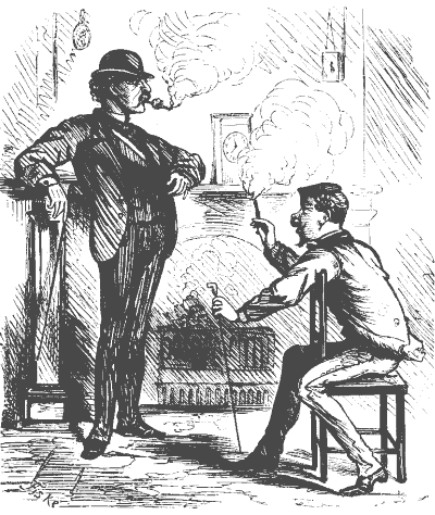 SYMPATHY WITH CUBA. Enthusiastic Sympathizer. "What I say is, we must have our cigars; and therefore, Cuba must be ours." PUNCHINELLO'S LYRICS. No. 1. Ho! I am the jolly repeater, And I train with the magical band, Who the legerdemain of the ballot With the skill of a wizard command. Once a year every poll I explore, Honest voting is Greenland to me; Free suffrage is ever my motto, To my amnesty judges agree. The trickster inspector I loathe, sir! Or the canvasser's pencils that thieve; Voting early and often is nobler Than ballots to change from one's sleeve. No eight hours' labor I ask for, Votes from sunrise to sunset I cast; They are bread on political waters, And my sinecures follow them fast. WILLIAM B. and his millionaire crew Will only vote once, sir; while I (Who to scorn laugh the honest assessors) Plump a score to their one—on the sly! Who asks for my name? I repeat it— Ho! the jolly repeater am I; Each book of the registry knows me, And I'm now in the market—Who'll buy? (The above may be sung da capo, which is Italian for "repeat.") Music and Morals in Chicago. The Marriage of Figaro did not interest the Chicago people when it was produced in that peculiar city. Had it been called the "Divorce of Figaro," it would have aroused their warmest admiration. MR. GREELEY'S AIDS TO LITERARY EFFORT. On the general principle that "no one is a hero to his valet," not even a valetudinarian, it may be safely asserted that the divinity that doth hedge most great writers is lost the moment their admirers become acquainted with their habits of thought and methods of composition. The popular delusion that H.G. "knows every thing" is calculated to work indefinite injury to some modest men who are supposed to "know something." GREELEY'S mind, like a camera obscura, may be said to retain its impressions while in the dark, and to lose them when exposed to the light. He has never, to any extent, heeded the scriptural injunction against walking in darkness, which explains why so many Tribune readers are in the dark concerning the truth and justice of popular questions. Consequently, as in the case of other great men, when GREELEY'S mind becomes pregnant with a theme, moved to pity by the neglected education and limited mental resources of many of his readers, he repairs to one of his numerous literary lairs, and ransacks the pages of the Past for plunder befitting his pen and party. When he is about to write an editorial article on Protection, he invariably prepares his mind by reading several chapters on the "Manly Art of Self-Defense," which accounts for the wisdom and brilliancy displayed by him on the subject of tariffs. In order to approach a discussion of the subject of vegetarianism without prejudice, H.G. repairs to the wheezy WINDUST'S, where, for hours at a time, he literally "crams" with his favorite dish of pork and beans. The Amelioration of the condition of the Working Classes is another favorite theme with GREELEY, and, in order to discuss clearly and cogently the many phases and ramifications of this lively and exciting topic, he devotes several hours to the study of "Idleness as a Fine Art." Before writing a particularly funny or spirited article upon Politics, the Fine Arts, or the Drama, H.G., it is said, may be seen for several hours at the Astor Library, poring over BURTON'S Anatomy of Melancholy. While in the throes of literary labor upon The Great Conflict, he had numerous dogmatic discussions with Mr. KIT BURNS, participated in several flights of the "fancy" to the bird-battling haunts of New Jersey, and even pursued the ministers of muscle to the scene of their bucolic pastimes in the P.R. It is, perhaps, unnecessary to remark that Mr. GREELEY'S Recollections of a Busy Life were inspired almost directly by frequent collusion with the pages of DE QUINCEY and COLERIDGE, whose wild lives and turbulent experiences possess a peculiar charm for the Triton of the Tribune. When Mr. GREELEY wishes to write against capital punishment—which he does about every time the moon changes—he naturally turns over a few pages of Thirty Years in Washington. When he purposes to tempt the bounding bean of the kitchen garden of Chappaqua, or humble the hopeful harrow of agriculture, he may be found either at the Italian Opera, serenely sleeping under the soporific strains of Sonnambula, or at the Circus, benignly blinking at the agglomerating Arabs. The inspiration for that thrilling story in real life, entitled, What I Know about Farming, is said to have been received almost wholly from the state of somnolency induced by that clever clairvoyant, the Rev. Dr. CHAPIN. A curious notion exists in the minds of a few ignorant persons, to the effect that Mr. GREELEY vexes his mellow mind for essays on the temperance question with frequent and numerous imbibitions of "soda straight;" but it is high time that this popular error was exploded. All who have seen Mr. GREELEY in the bar-room of a certain city hotel, dashing down brandy or pouring down whisky, and have next morning perused a Tribune editorial on "The Evils of Intemperance," need not be reminded of the chief source of H.G.'s animated style and vigorous diction. An extended walk along the beautiful avenues of the city, or a drive through Central Park, invariably prepares Mr. GREELEY's mind for the birth of an article on the advantages to young men of leaving the metropolis and seeking homes in the West. Some months ago, Mr. GREELEY purchased a small, select library, which contains, among other choice works, the sweet pastoral productions of SYLVANUS COBB, Jr.; the quaint and exhilarating narratives of EUGENE SUE; the wholesome and harmless fictions of NED BUNTLINE, together with the complete poetical works of MARTIN FARQUHAR TUPPER, and it was from the perusal of these comforting and pellucid contributions to American literature that Mr. GREELEY caught the spirit and the style which distinguish his thrilling work on Political Economy. B