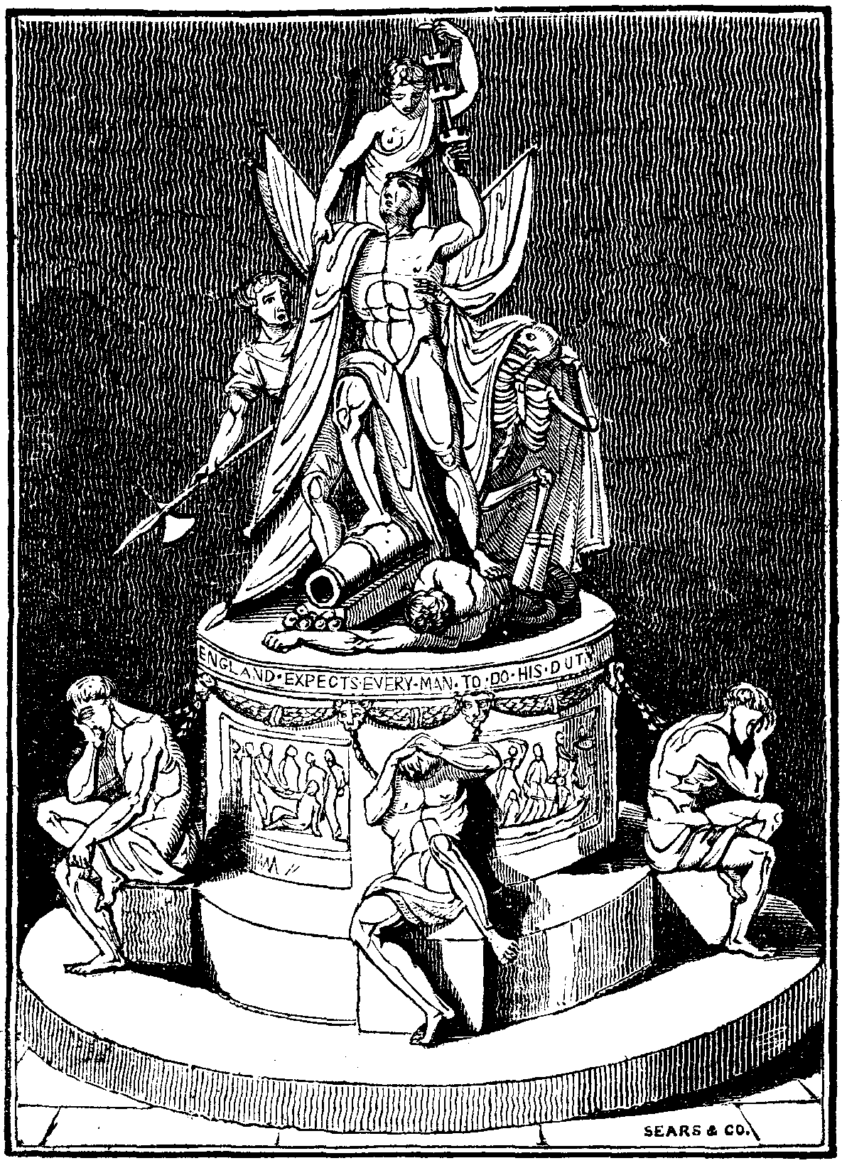 On a basis of Westmoreland marble stands a circular pedestal of the same material, and peculiarly suitable in colour to the group which it supports. At the base of the pedestal are four emblematic figures, in the character of captives, or vanquished enemies, in allusion to Lord Nelson's victories. The spaces between these figures, on the sides of the pedestal, are filled by four grand bas-reliefs, executed in bronze, representing some of the great naval actions in which Nelson was engaged. The other parts of the pedestal are richly decorated with lions' heads and festoons of laurel; and in a moulding round the upper part of it is inscribed, in brass letters, pursuant to the resolution of [pg 274] the general meeting, that most impressive charge delivered by the illustrious commander previous to the commencement of the battle of Trafalgar, "ENGLAND EXPECTS EVERY MAN TO DO HIS DUTY."