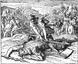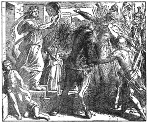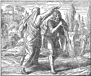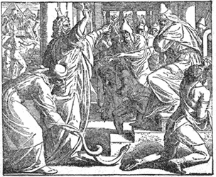 After this Moses and Aaron went to Pharaoh, and told him that it was the Lord's command that he should let the Israelites go. Pharaoh knew nothing about God, and became very angry, saying that Moses and Aaron kept the people from their work by telling them such things; and he treated the poor Israelites worse than before.