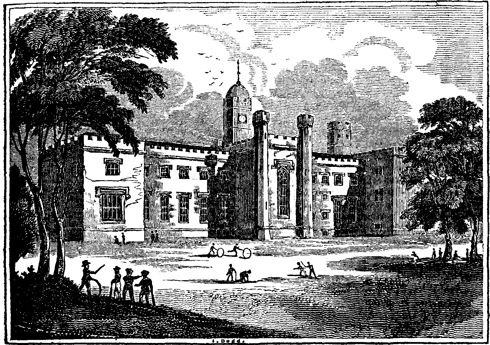 The ancient buildings of the Rugby seminary were a humble tenement for the schoolmaster, a principal school-room, and two or three additional school-rooms, built at different times, as the finances would allow. These being found too limited, in 1808 the trustees commenced the erection of the present structure, from the designs of Mr. Henry Hakewill. It stands nearly on the same spot as the former humble building, and is composed of white brick, the angles, cornices, and dressings to the windows and openings being of Aldborough stone. The style of architecture is that of the reign of Elizabeth, the period at which the school was founded. The building is massy, august, and interesting from its graceful disposition of parts. The principal front is that represented in our engraving, which extends 220 feet.