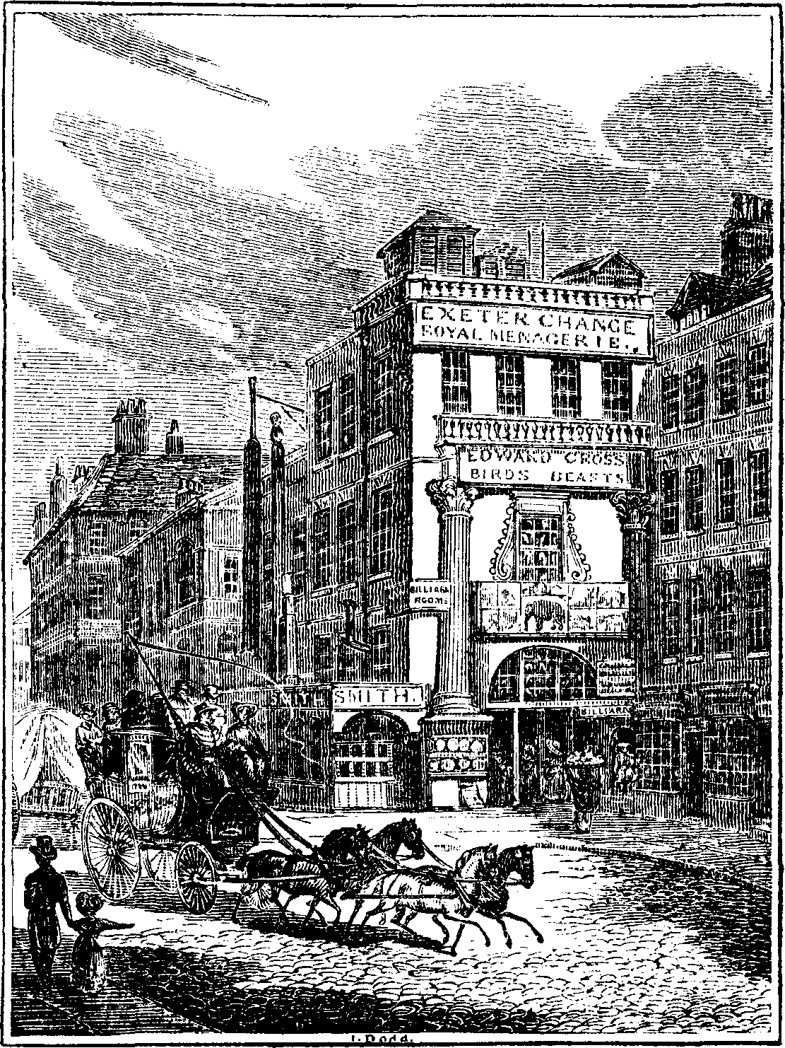 Who has not heard of Exeter 'Change? celebrated all over England for its menagerie and merchandize—wild beasts and cutlery—kangaroos and fleecy hosiery—elephants and minikin pins—a strange assemblage of nature and art—and savage and polished life.
