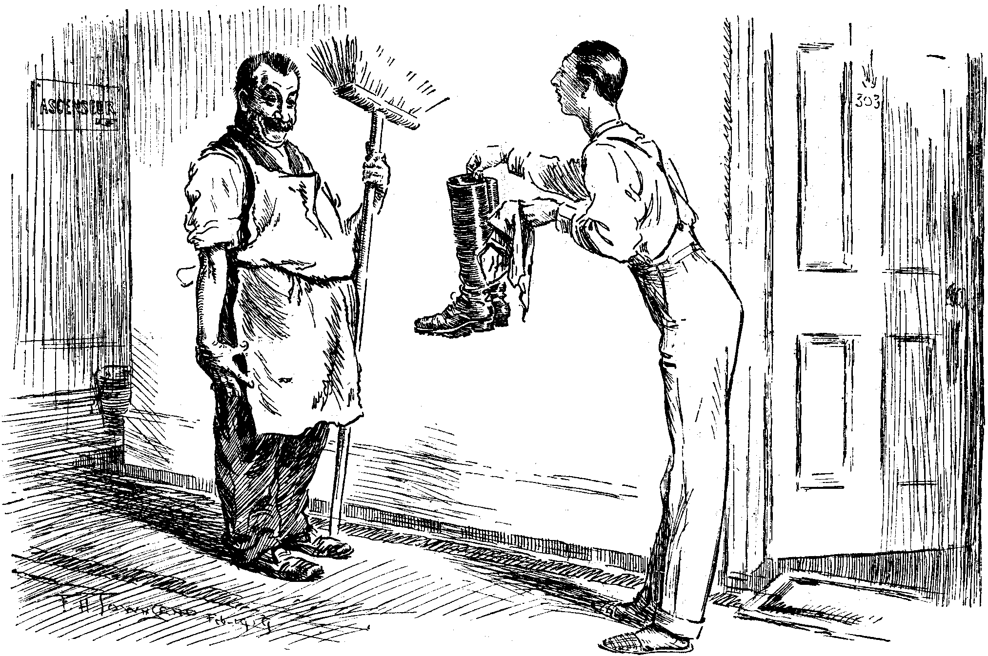 Taking the proud motto of the MOND dynasty—"Make yourself necessary"—for guide, he became something different every day in his quest after an "Essential Trade." He was in turn a one-man-business, a railway-porter, a coal-miner, a farmer, a NORTHCLIFFE leader-writer, a taxi-baron, a jazz-professor and a non-union barber. At one moment he was single, an orphan alone and unloved; at another he had a drunken wife, ten consumptive young children and several paralytic old parents to support. All to no avail; nobody would believe him.