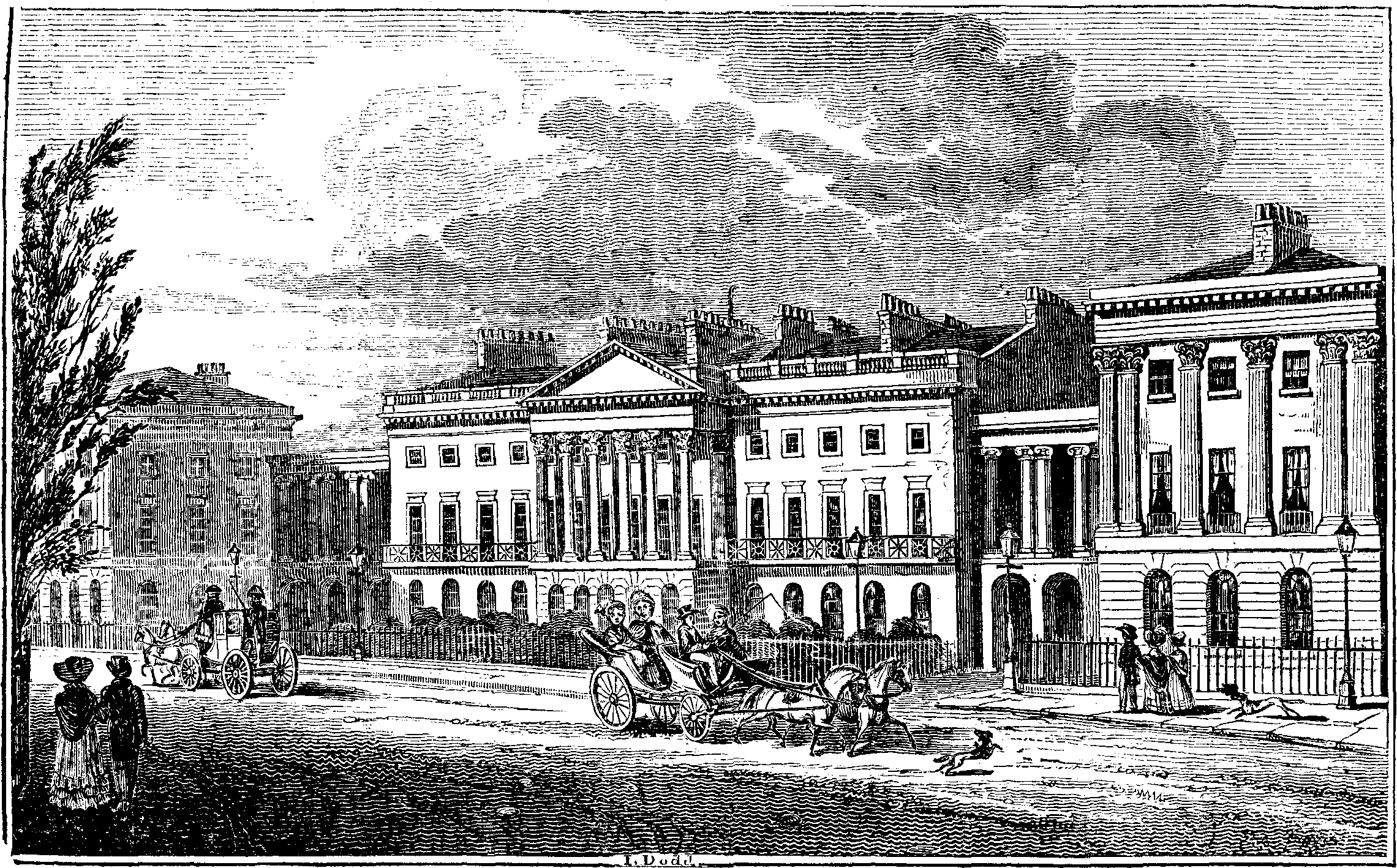 The annexed continuation of our illustrated ramble in the Regent's Park is named Clarence Terrace, in compliment to the illustrious Lord High Admiral of England. It consists of a centre and two wings, of the Corinthian order, connected by colonnades of the Ilyssus Ionic order, and altogether presents a picturesque display of Grecian architecture. The three stories are a rusticated entrance, or basement; and a Corinthian drawing-room and chamber story; surmounted with an elegant entablature and balustrade. In the details, the spectator cannot fail to admire the boldness and richness of the columns supporting the pediment in the centre, and the classic beauty of the pilasters which decorate the wings.