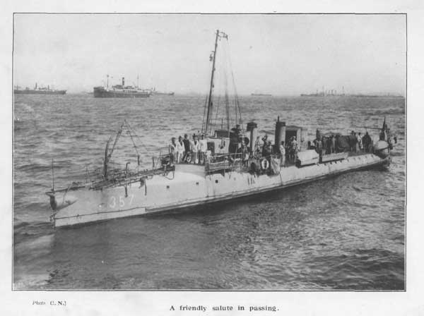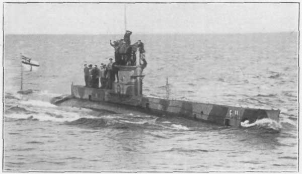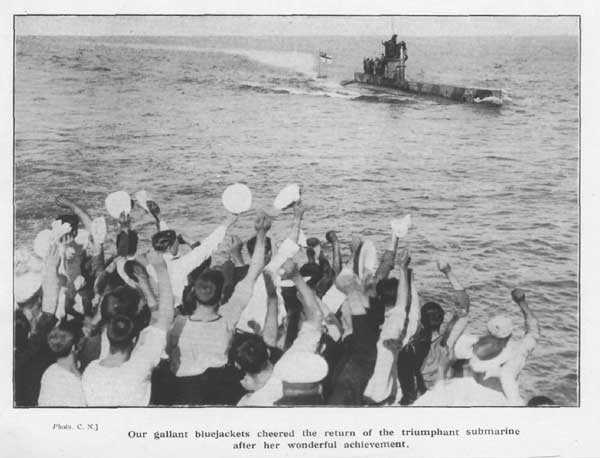 The sea seemed thick with boats pulling steadily away, and in every direction the searchlights of the escorting destroyers wheeled and flashed, as they rushed in circles, hunting for the submarine which had struck the blow.