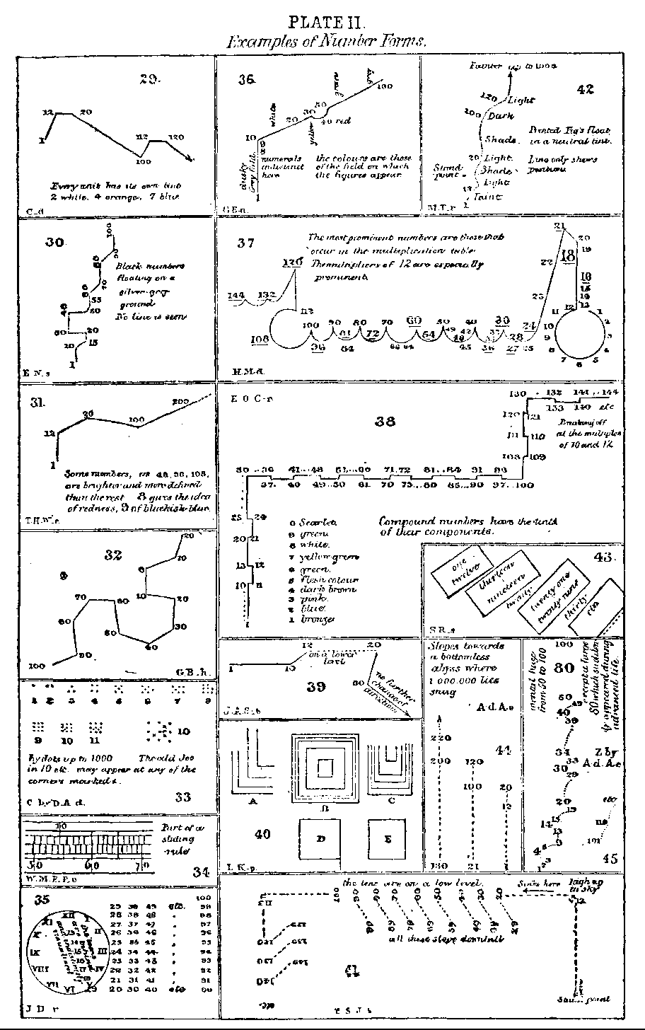 General account of the peculiarity; mutually corroborative statements; personal evidence given at the Anthropological Institute; specimens of a few descriptions and illustrative woodcuts; great variety in the Forms; their early origin; directions in which they run; bold conceptions of children concerning height and depth; historical dates, months, etc.; alphabet; derivation of the Forms from the spoken names of numerals; fixity of the Form compared to that of the handwriting; of animals working in constant patterns; of track of eye when searching for lost objects; occasional origin from figures on clock; from various other sources; the non-decimal nomenclature of numerals; perplexity caused by it. Description of figures in Plate I.; Plate II.; Plate III.; Plate IV. Colours assigned to numerals (see 105); personal characters; sex; frequency with which the various numerals are used in the Talmud.