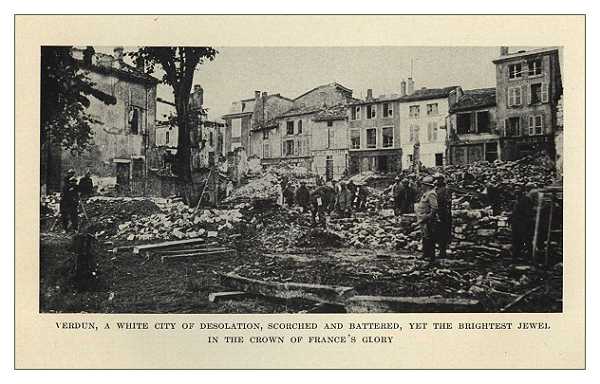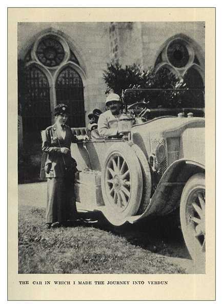 As we passed through the Headquarters of General Nivelle, he sent down word to us not to wait to call on him then, but to proceed at once to Verdun as later the passage would become more difficult. He kindly sent down to us one of the officers of his staff to act as escort. The officer sat by our chauffeur, warning him of the' dangerous spots in the road which the Germans had the habit of "watering" from time to time with "marmites," and ordering him to put on extra speed. Our speed along the road into Verdun averaged well over a mile a minute.
