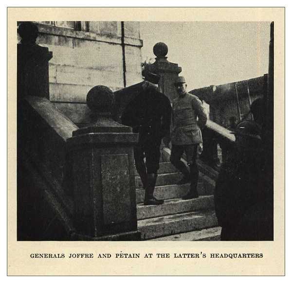 I saw one horse that looked exactly like a plaster statuette. His master had scrubbed him down, but before he dried the white dust had settled on him everywhere. Naturally humans do not escape. By the time our party reached the Headquarters of General Petain we had joined the White Brigade. I excused myself to the General, who smilingly replied: "Why complain, Mademoiselle, you are charming; your hair is powdered like that of a Marquise." The contrast with what had been a black fur cap on what was now perfectly white hair justified his compliment. I have never been renowned in my life for fear of any individual, but I must admit that I passed into the presence of General Petain with a great deal of respect amounting almost to awe. The defence of Verdun through the bitter months of February and March by General Petain, a defence which is now under the immediate control of his able lieutenants General Nivelle and General Dubois, has earned the respect and admiration of the whole world. It is impossible not to feel the deepest admiration for these men who have earned such undying glory, not only for themselves, but for their Motherland.