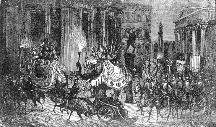 Whenever there was any foreign war to be carried on with a distant nation or tribe, there was always a great eagerness among all the military officers of the state to be appointed to the command. They each felt sure that they should conquer in the contest, and they could enrich themselves still more rapidly by the spoils of victory in war, than by extortion and bribes in the government of a province in peace. Then, besides, a victorious general coming back to Rome always found that his military renown added vastly to his influence and power in the city. He was welcomed with celebrations and triumphs; the people flocked to see him and to shout his praise. He placed his trophies of victory in the temples, and entertained the populace with games and shows, and with combats of gladiators or of wild beasts, which he had brought home with him for this purpose in the train of his army. While he was thus enjoying his triumph, his political enemies would be thrown into the back ground and into the shade; unless, indeed, some one of them might himself be earning the same honors in some other field, to come back in due time, and claim his share of power and celebrity in his turn. In this case, Rome would be sometimes distracted and rent by the conflicts and contentions of military rivals, who had acquired powers too vast for all the civil influences of the Republic to regulate or control.