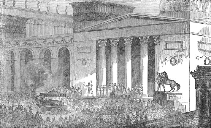 This settled the question, and the whole company were soon in the wildest excitement with the work of building up a funeral pile upon the spot. At first they brought fagots and threw upon the fire, then benches from the neighboring courts and porticoes, and then any thing combustible which came to hand. The honor done to the memory of a deceased hero was, in some sense, in proportion to the greatness of his funeral pile, and all the populace on this occasion began soon to seize every thing they could find, appropriate and unappropriate, provided that it would increase the flame. The soldiers threw on their lances and spears, the musicians their instruments, and others stripped off the cloths and trappings from the furniture of the procession, and heaped them upon the burning pile.