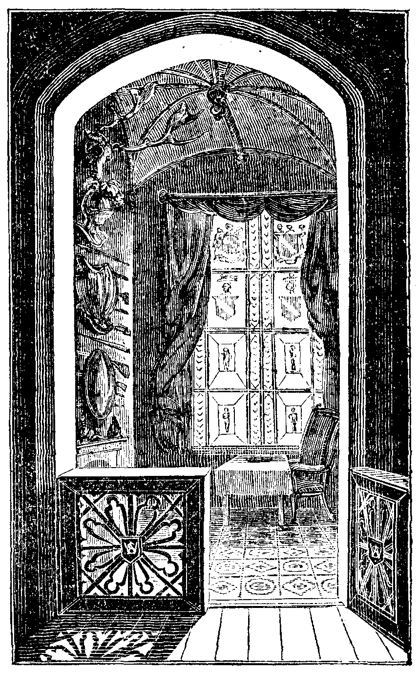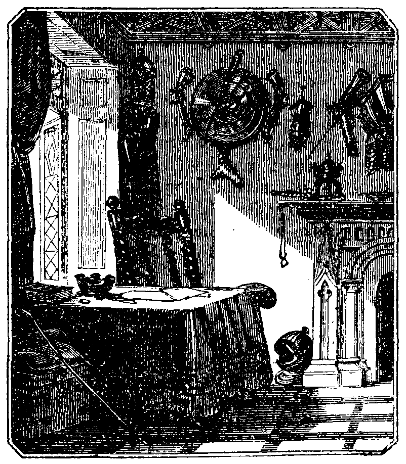It would occupy a whole sheet to describe the interior of the mansion; so that we select only two apartments, as graphic memorials of the lamented owner. First, is the Armoury, (from a coloured lithograph, published by Ackermann)—an arched apartment, with a richly-blazoned window, and the walls filled all over with smaller pieces of armour and weapons, such as swords, firelocks, spears, arrows, darts, daggers, &c. These relics will be found enumerated in a description of Abbotsford, in the Anniversary, quoted in vol. xv. of the Mirror. The second of the interiors is the poet's Study—a room about twenty-five feet square by twenty feet high, containing of what is properly called furniture, nothing but a small writing-table and an antique arm-chair. On either side of the fire-place various pieces of armour are hung on the wall; but, there are no books, save the contents of a light gallery, which runs round three sides of the room, [pg 249] and is reached by a hanging stair of carved oak in one corner. There are only two portraits—an original of the beautiful and melancholy head of Claverhouse, and a small full-length of Rob Roy. Various little antique cabinets stand about the room; and in one corner is a collection of really useful weapons—those of the forest craft, to wit—axes and bills, &c. Over the fire-place, too, are some Highland claymores clustered round a target. There is only one window, pierced in a very thick wall, so that the place is rather sombre.