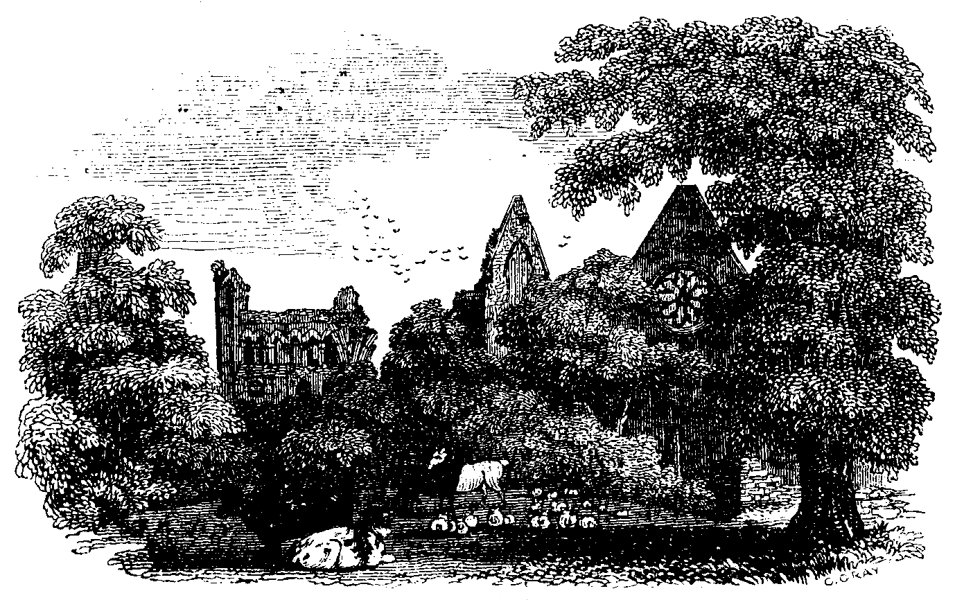 Since Sir Walter's appointment to the sheriffdom of Selkirkshire, he had resided at Ashiesteel, on the banks of the Tweed, of which he was but the tenant. He was now desirous to purchase a small estate, and thereon build a house according to his own taste. He found a desirable site six or seven miles farther down the Tweed, in the neighbourhood of the public road between Melrose and Selkirk, and at nearly an equal distance from both of those towns: it was then occupied by a little farm onstead, which bore the name of Cartley Hole. The mansion is in what is termed the castellated Gothic style, embosomed in flourishing wood. It takes its name from a ford, formerly used by the monks of Melrose, across the Tweed, which now winds amongst a rich succession of woods and lawns. But we will borrow Mr. Allan Cunningham's description of the estate, written during a visit to Abbotsford, in the summer of 1831:—"On the other side of the Tweed we had a fine view of Abbotsford, and all its policies and grounds. The whole is at once extensive and beautiful. The fast rising woods are already beginning to bury [pg 248] the house, which is none of the smallest; and the Tweed, which runs within gun-shot of the windows, can only be discerned here and there through the tapestry of boughs. A fine, open-work, Gothic screen half conceals and half shows the garden, as you stand in front of the house—(see the Engraving.) It was the offspring of necessity, for it became desirable to mask an unseemly old wall, on which are many goodly fruit-trees. What we most admired about the estate, was the naturally useful and elegant manner in which the great poet has laid out the plantations—first, with respect to the bounding or enclosing line; and secondly, with regard to the skilful distribution of the trees, both for the contrast of light and shade, and for the protection which the strong affords to the weak.8 The horizontal profile of the house is fine, crowded with towers and clustered chimneys: it looks half castle, half monastery. The workmanship, too, is excellent: indeed we never saw such well-dressed, cleanly, and compactly laid whinstone course and gage in our life: it is a perfect picture."9 "The external walls of Abbotsford, as also the walls of the adjoining garden, are enriched with many old carved stones, which, having originally figured in other situations, to which they were calculated by their sculptures and inscriptions, have a very curious effect. Among the various relics which Sir Walter has contrived to collect, may be mentioned the door of the old Tolbooth of Edinburgh, which, together with the hewn stones that composed the gateway, are now made to figure in a base court at the west end of the house."10