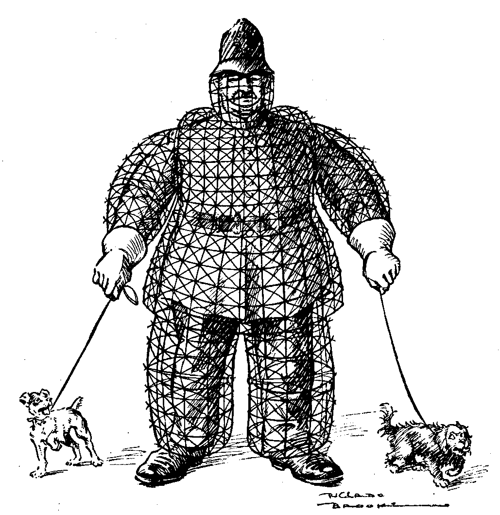 BARBED WIRE-MESH OVERALLS DESIGNED TO PREVENT THE POLICE FROM STRIKING AS A PROTEST AGAINST HAVING TO INTERN UNMUZZLED DOGS.
