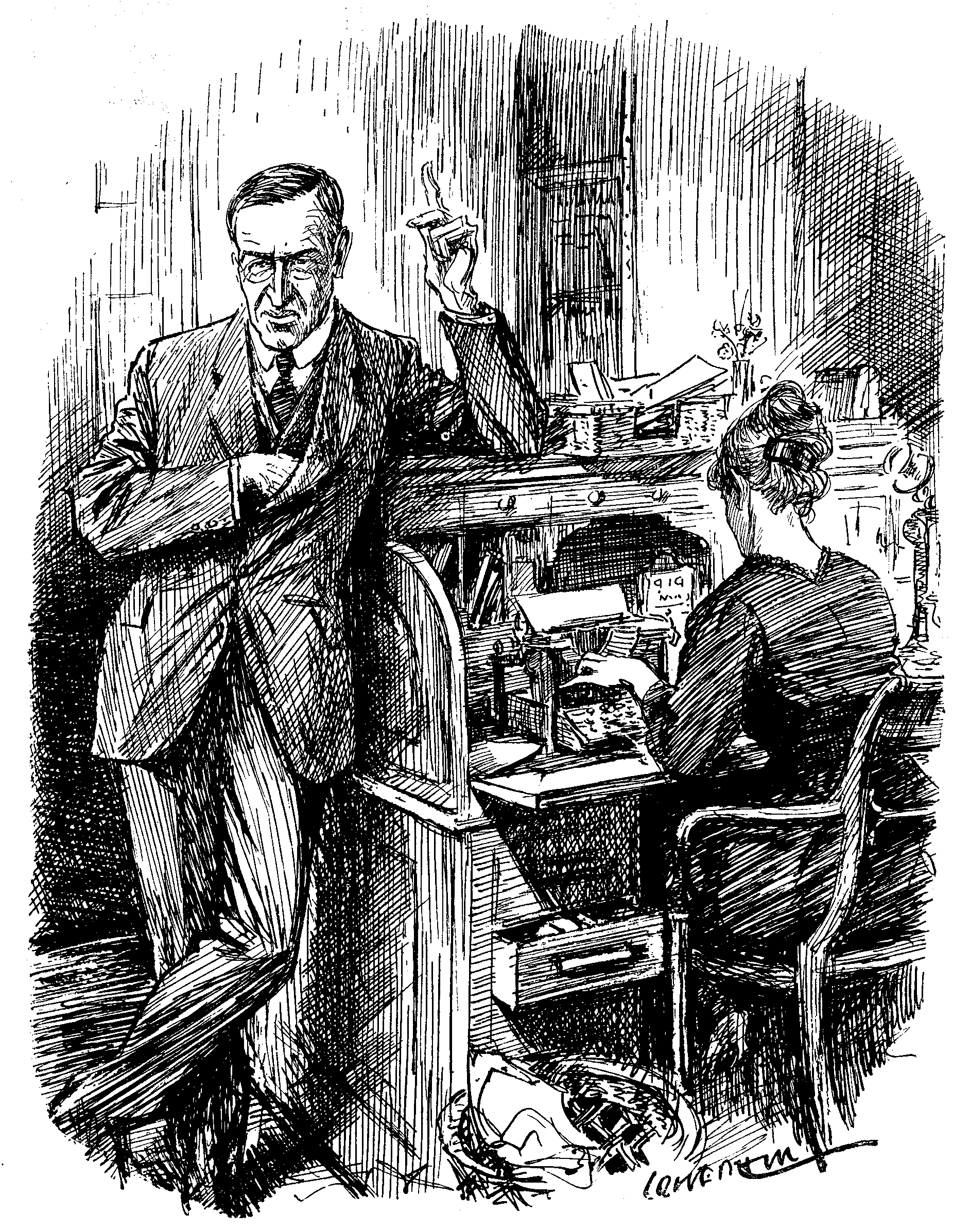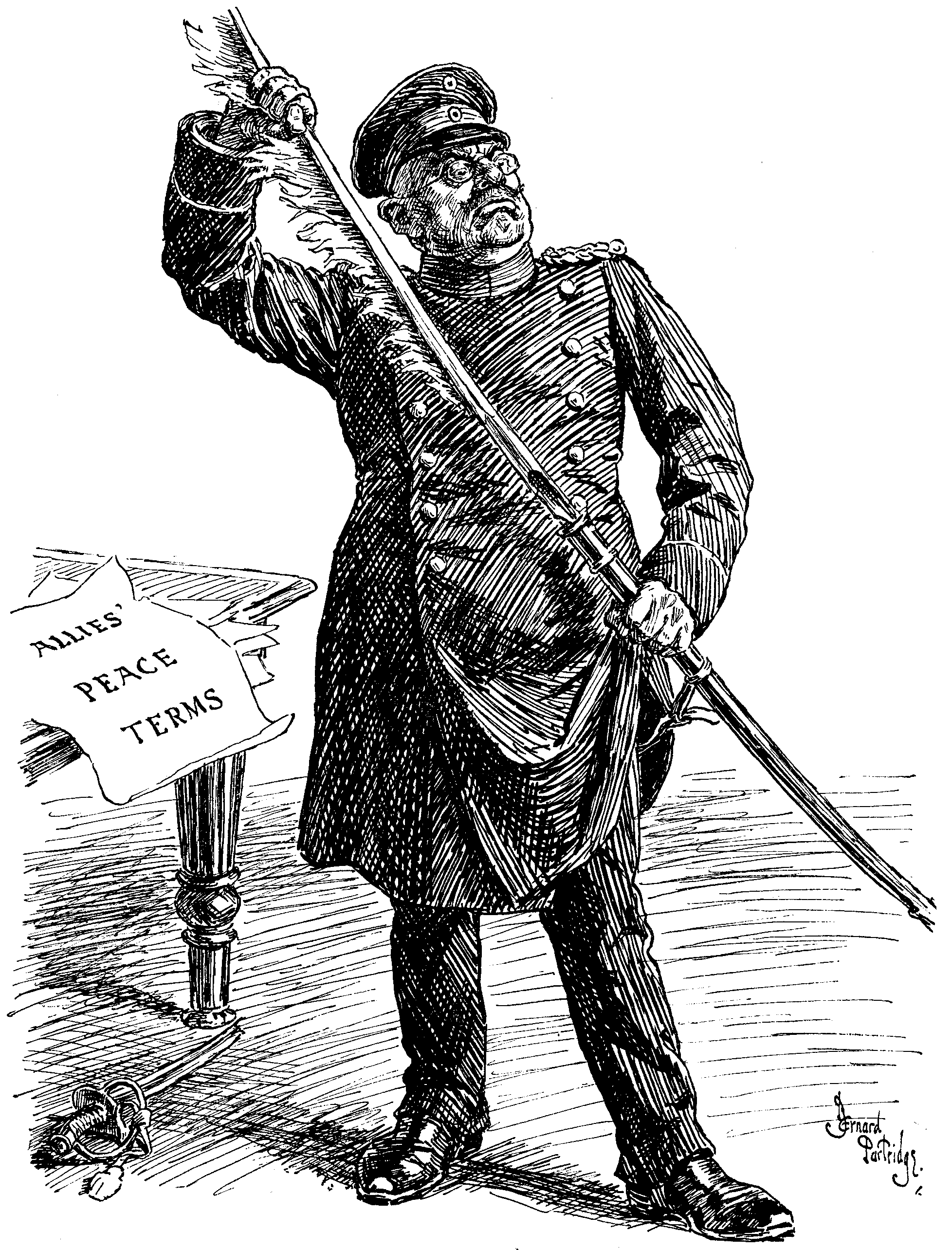 PRESIDENT WILSON (dictating a message to the American Nation). "AT LAST WE MAY FAIRLY SAY THAT THE DOVE OF PEACE HAS SIGHTED DRY LAND." (Pauses). "ONE MOMENT—I'M NOT QUITE SURE THEY'LL LIKE THAT WORD 'DRY.'"