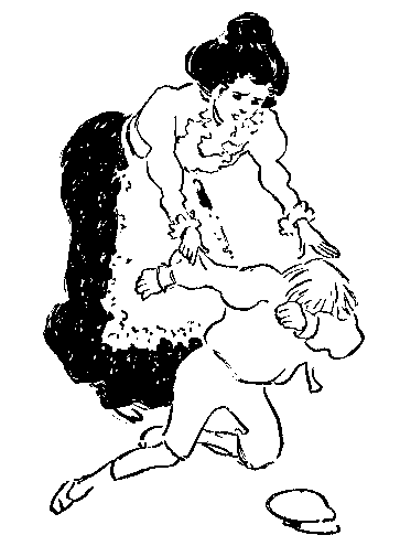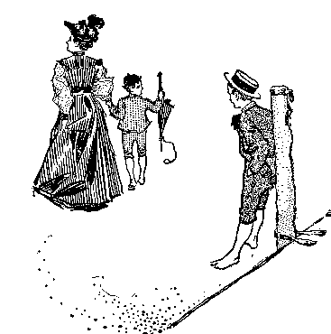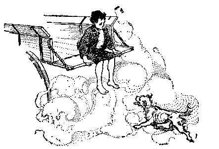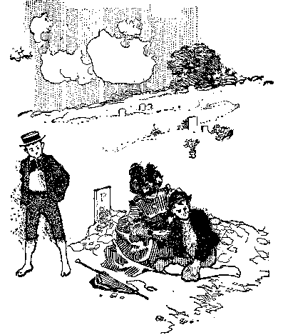 What passed in the ring as Bud left it, bedraggled and dusty, did not interest him. He brushed himself as he went. The band was playing madly, and the young woman in the stiff skirts was standing by her horse ready to mount. The crowd did not stop laughing; Bud inclined his head to dust his knickerbockers, and then in a tragic instant he saw what was convulsing the multitude with laughter. The outer seam of the right leg of his velveteen breeches was gone, and a brown leg was winking in and out from the flapping garment as he walked. Wildly he gathered the parted garment, and it seemed to him that he never would cover the ground between the ring and the benches. In the course of several æons—which the other boys measured by fleeting minutes—the wave of shame that covered Bud subsided. Pins bound up the wounds in his clothes. He drew a natural breath, and was able to join the mob which howled down the man who announced the concert.