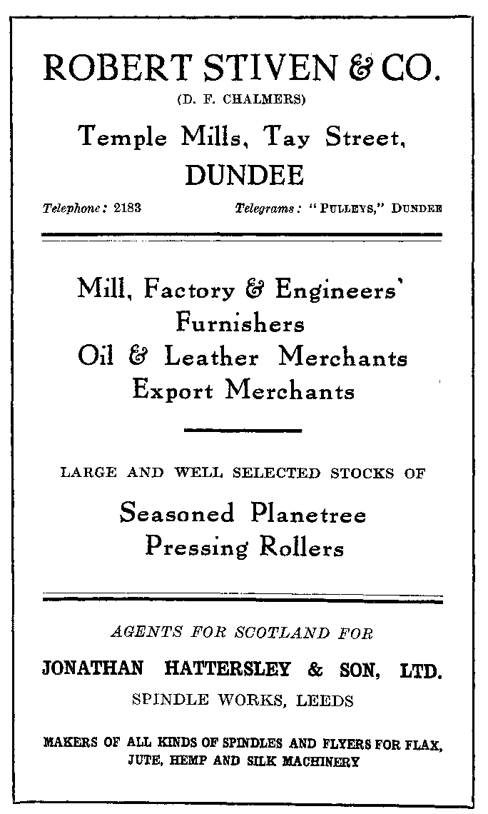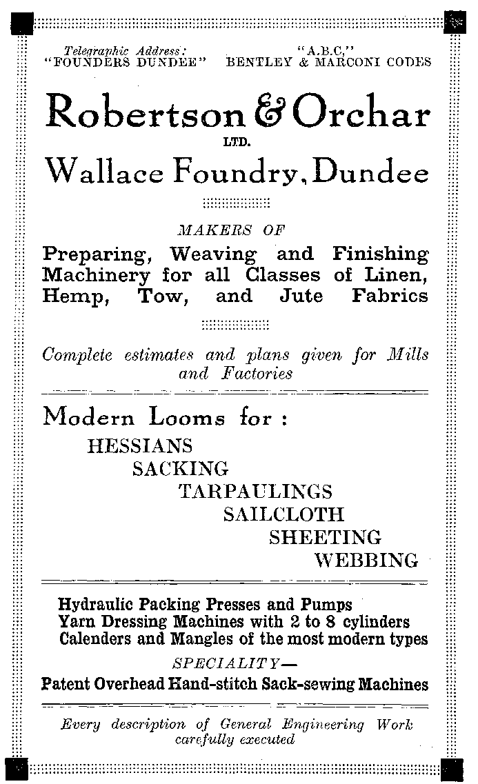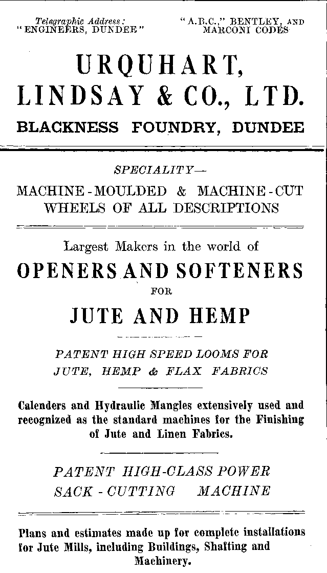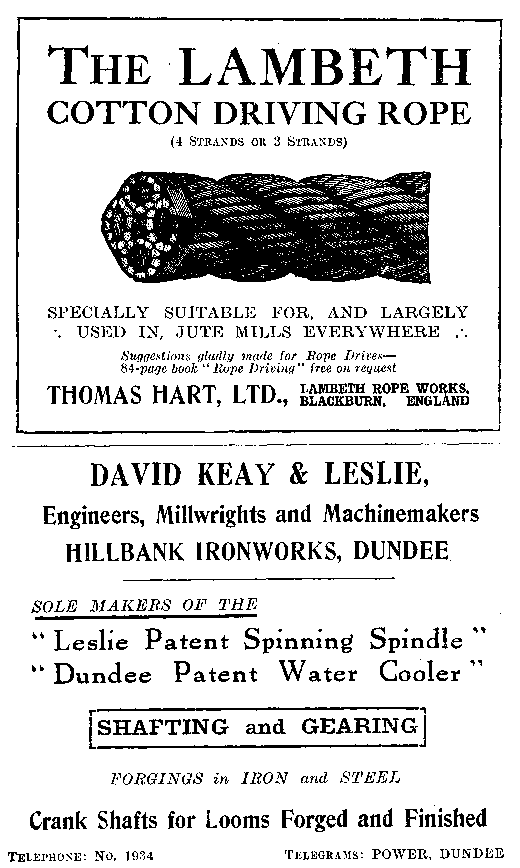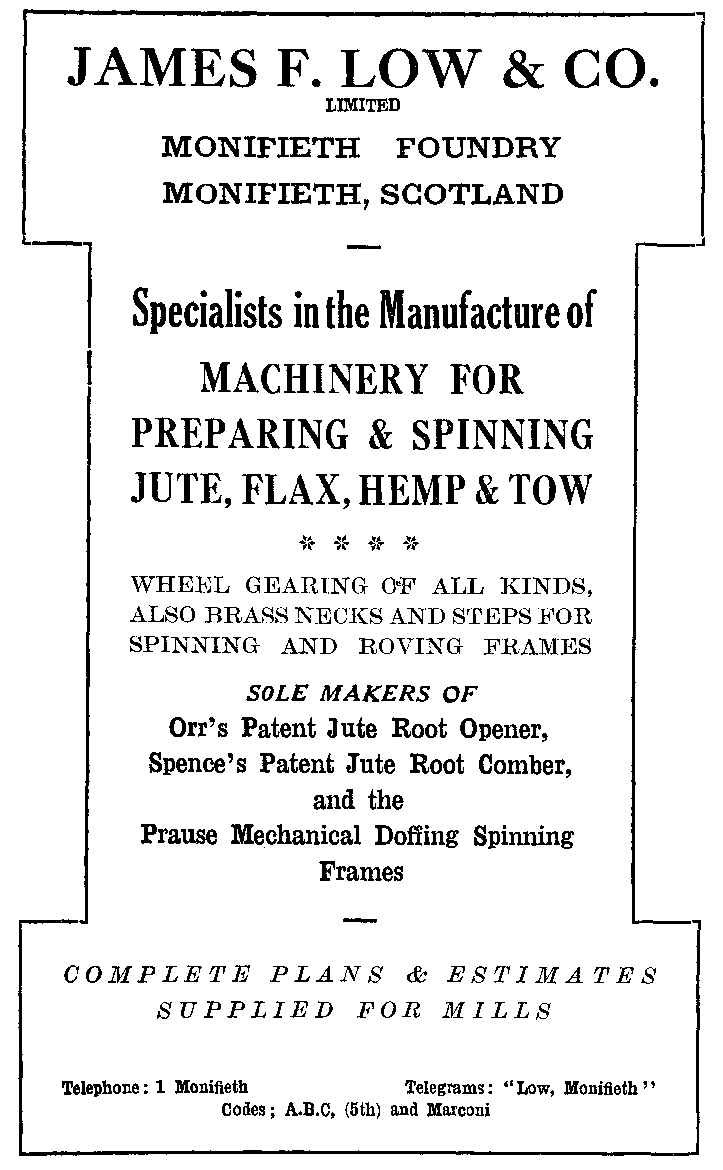 A glance into the records of the textile industries will reveal the fact that the jute fibre was practically unknown in these islands a hundred years ago. Unsuccessful attempts were certainly made to import the fibre into Great Britain in the latter part of the 18th century, and it has been used in India for centuries in the making of cord, twine and coarse fabrics, because the fibre is indigenous to that country. And since all the manufacturing methods there, for a considerable time were manual ones, the industry--if such it could be called--moved along slowly, providing employment only for the needs of a small section of the community on the Eastern shores.