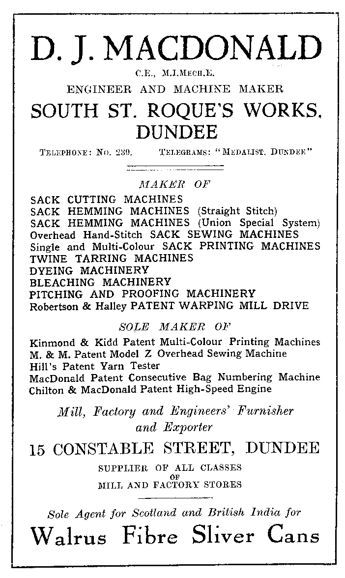 The ownership of the bags can thus be shown distinctly by one of the many methods of colour printing, and if any firm desires to number their bags consecutively in order to provide a record of their stock, or for any other purpose, the bags may be so numbered by means of a special numbering machine, also made by Mr. D. J. Macdonald.