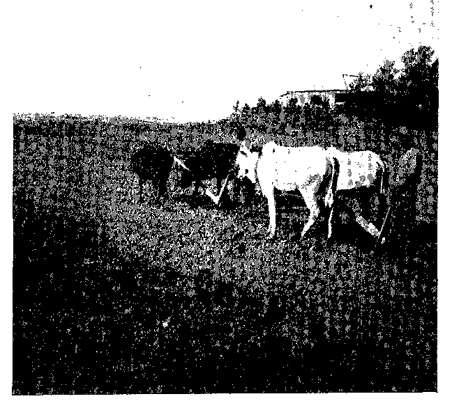 The ploughs are made of wood and faced with iron. Bullocks, in teams of two or more, are harnessed to the plough as shown in Fig. 1 where a field is being ploughed as a preliminary process in jute cultivation. The bullocks draw the plough in much the same way as horses do in this country.