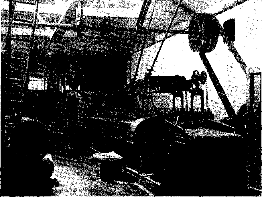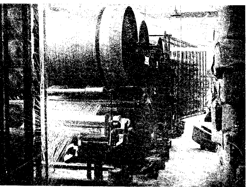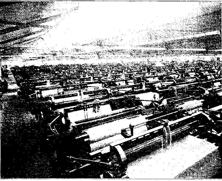 A weaving shed full of various types of looms, and all driven by belts from an overhead shaft, is illustrated in Fig. 35. The loom in the foreground is weaving a 3-leaf sacking similar to that illustrated at S, Fig. 32. while the appearance of a full weaver's warp beam is shown distinctly in the second loom in Fig. 35. There are hundreds of looms in this modern weaving shed.
