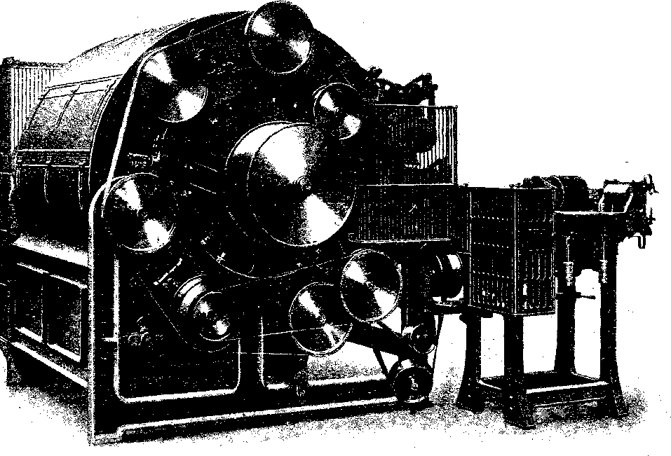The cloth is tensioned either by threading it over and under a series of stout rails, or else between two in a specially adjustable arrangement by means of which the tension may be varied by rotating slightly the two rails so as to alter the angle formed by the cloth in contact with them. This is, of course, at the feed side; the cloth is pulled through the machine by three rollers shown distinctly on the right in Fig. 42. This view illustrates a double cropper in which both the spirals are controlled by one belt. As the cloth is pulled through, both sides of it are cropped by the two spirals.[3] When four spirals are required, the frame is much wider, and the second set of spirals is identical with those in the machines illustrated.