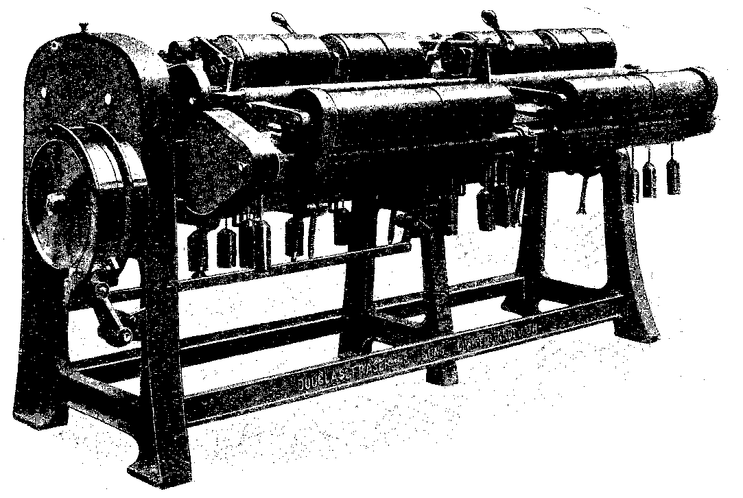The calenders for jute almost invariably contain five different rollers, or "bowls," as they are usually termed; one of these bowls, the smallest diameter one, is often heated with steam. A five-bowl calender is shown on the extreme right in Fig. 41, and in the background, while a complete illustration of a modern 5-bowl calender, with full equipment, and made by Messrs. Urquhart, Lindsay & Co., Ltd., Dundee, appears in Fig. 44.