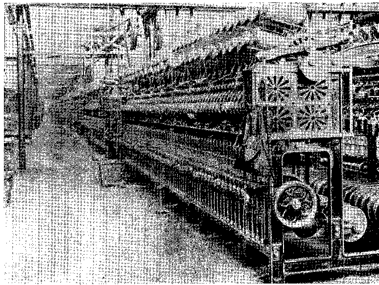 A cropping machine is shown in the foreground of Fig. 41, and in this particular case there are two fabrics being cropped or cut at the same time; these happen to be figured fabrics which have been woven in a jacquard loom similar to that illustrated in Fig. 38. The fabrics are, indeed, typical examples of jute Wilton carpets. The illustration shows one of the spiral croppers in the upper part of the machine in Fig. 41. Machines are made usually with either two or four of such spirals with their corresponding fixed blades.