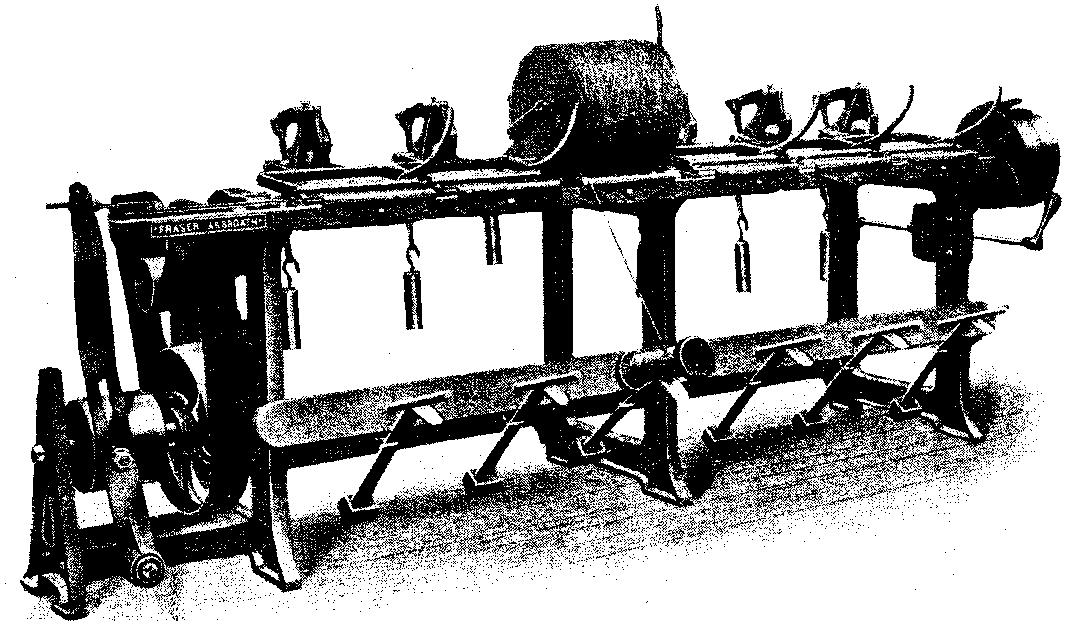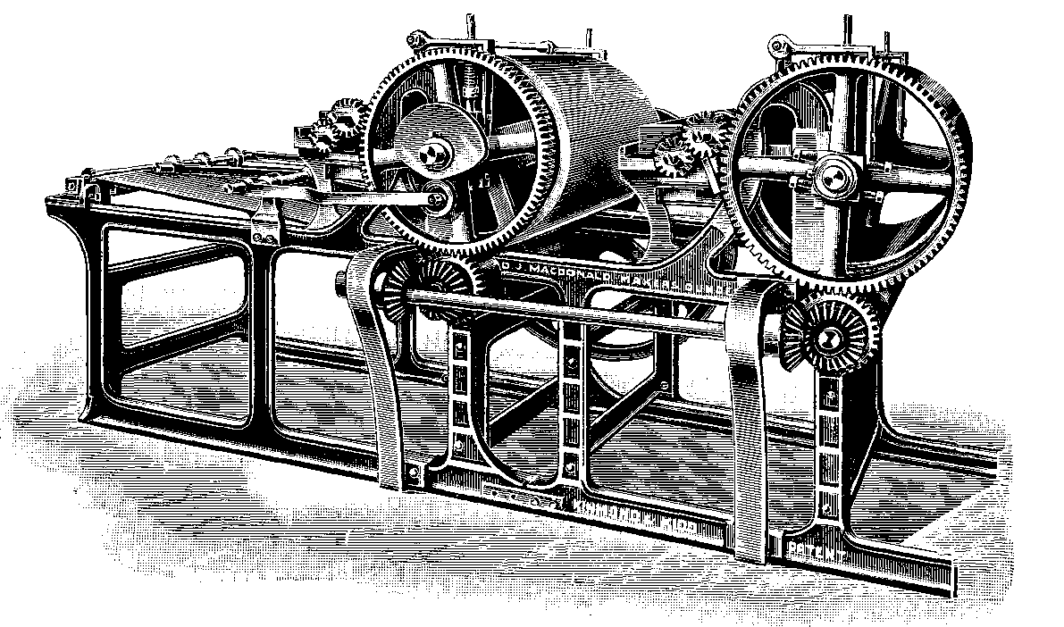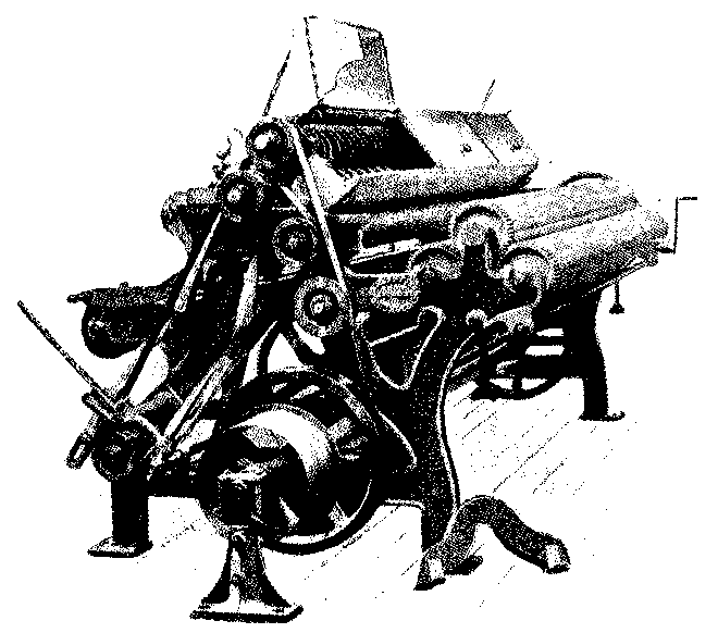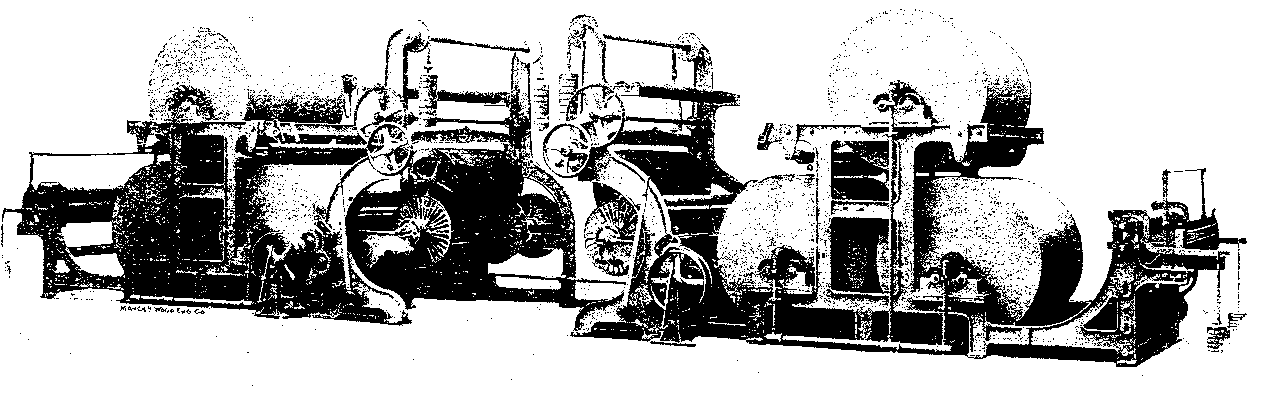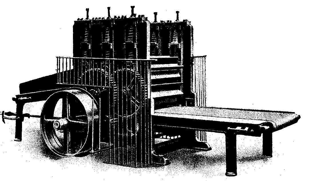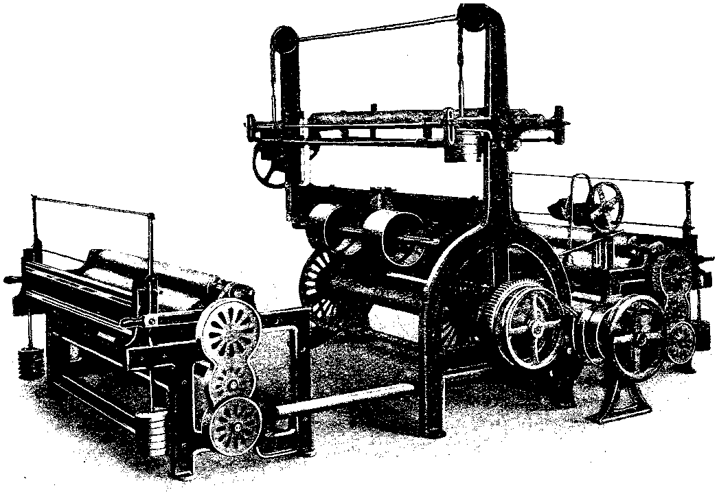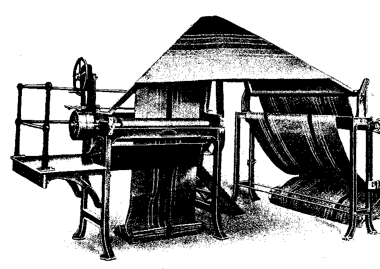 The high structure on the left is the accumulator, the manipulation of this and the number of wide weights which are ingeniously brought into action to act on the plunger determine the pressure which is applied to the fabrics between the bowls or rollers.