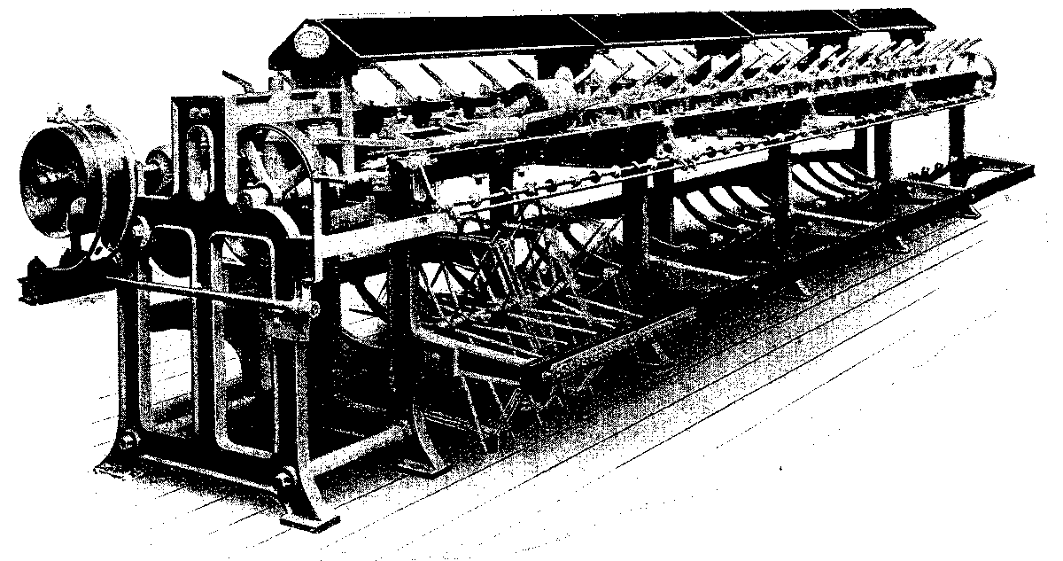In the modern dressing machine, such as that illustrated in Fig. 30, there are six steam-heated cylinders to dry the starched yarns before the latter reach the loom beams. Both banks, or rather part of both, can be seen in this view, from which some idea will be formed of the great length occupied. Several of the threads from the spools in the left bank are seen converging towards the back reed, then they pass between the two rollers--the bottom one of which is partially immersed in the starch trough--and forward to the second reed. After the sheet of threads leaves the second reed, it passes partially round a small guide roller, then almost wholly round each of three cylinders arranged °o°, and finally on to the loom beam. Each cylinder is 4 feet diameter, and three of them occupy a position between the left supplementary frame, and the central frame in Fig. 29, while the remaining three cylinders are similarly disposed between the central frame and the supplementary frame of the right in the same illustration.