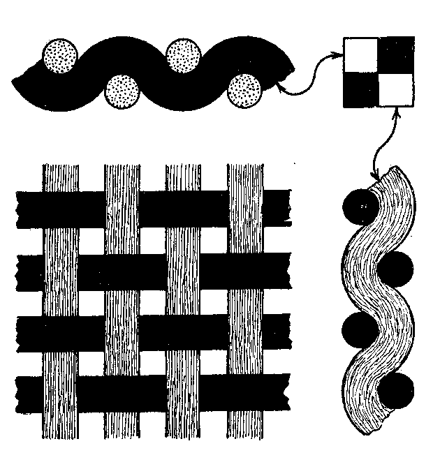 The solid squares in weave A, Fig. 33, are reproduced in the left-hand bottom corner of Fig. 34. A diagrammatic plan of a plain cloth produced by this simple order of interlacing is exhibited in the upper part by four shaded threads of warp and four black picks of weft (the difference is for distinction only). The left-hand intersection shows one thread interweaving with all the four picks, while the bottom intersection shows all the four threads interweaving with one pick. The two arrows from the weave or design to the thread and pick respectively show the connection, and it will be seen that a mark (solid) on the design represents a warp thread on the surface of the cloth, while a blank square represents a weft shot on the surface, and vice versa.