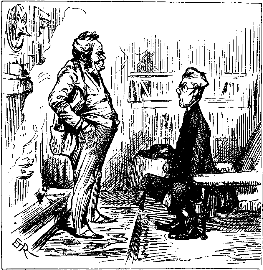 This conversation took place towards the end of last Session but one. By odd coincidence I had met the Member for Sark as I was coming from OLD MORALITY's room, where I had been quietly dining with him, JACKSON and AKERS-DOUGLAS made up party of four. It was second week of August; everybody tired to death. OLD MORALITY asked me to look in and join them about eight o'clock. Knocked at door; no answer; curious scurrying going round; somebody running and jumping; heard OLD MORALITY's voice, in gleeful notes, "Now then, DOUGLAS, tuck in your tuppenny! Here you are, JACKSON! keep the mill a goin'!" Knocked again; no answer; opened door gently; beheld strange sight. The Patronage Secretary was "giving a back" to the FIRST LORD of the TREASURY. OLD MORALITY, taking running jump, cleared it with surprising agility considering AKERS-DOUGLAS'S inches. Then he trotted on a few paces, folded his arms and bent his head; Financial Secretary to Treasury, clearing AKERS-DOUGLAS, took OLD MORALITY in his stride, and "tucked in his tuppenny" in turn.
