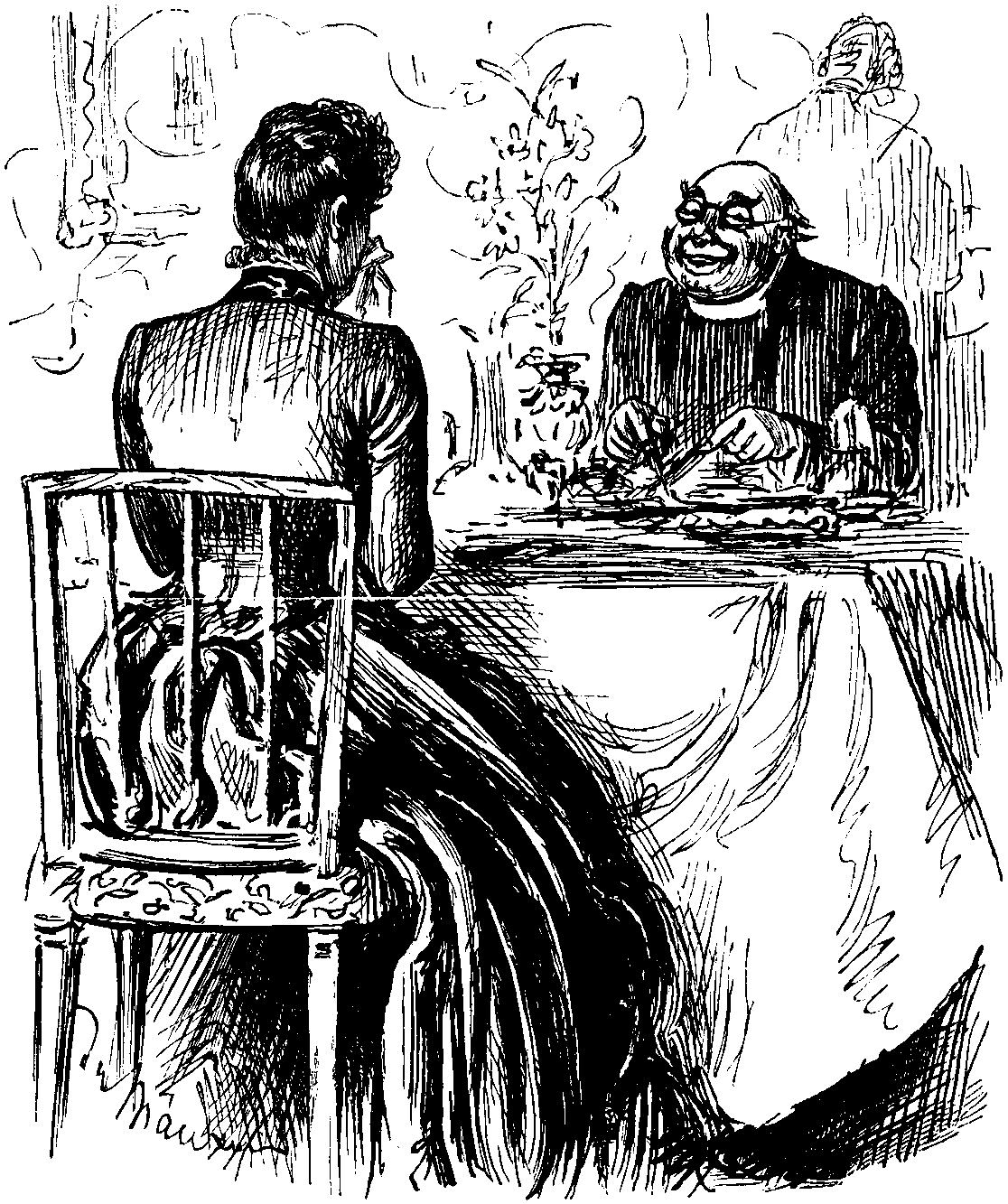 And thus BOB was ordained, and, having married CATHERINE, he accepted the family living of Wendover, though not before he had taken occasion to point out to BLACK that family livings were corrupt and indefensible institutions. Still, the thing had to be done; and bitterly as BOB pined for the bracing air of the East End of London, he acknowledged, with one of his quick, bright flashes, that, unless he went to Wendover, he could never meet Squire MUREWELL, whose powerful arguments were to drive him from positions he had never qualified himself, except by an irrational enthusiasm, to defend. Of CATHERINE a word must be said. Cold, with the delicate but austere firmness of a Westmoreland daisy, gifted with fatally sharp lines about the chin and mouth, and habitually wearing loose grey gowns, with bodices to match, she was admirably calculated, with her narrow, meat-tea proclivities, to embitter the amiable SILLIMERE's existence, and to produce, in conjunction with him, that storm and stress, that perpetual clashing of two estimates without which no modern religious novel could be written, and which not even her pale virginal grace of look and form could subdue. That is a long sentence, but, ah! how short is a merely mortal sentence, with its tyrannous full stop, against the immeasurable background of the December stars, by whose light BOB was now walking, with heightened colour, along the vast avenue that led to Wendover Hall, the residence of the ogre Squire.