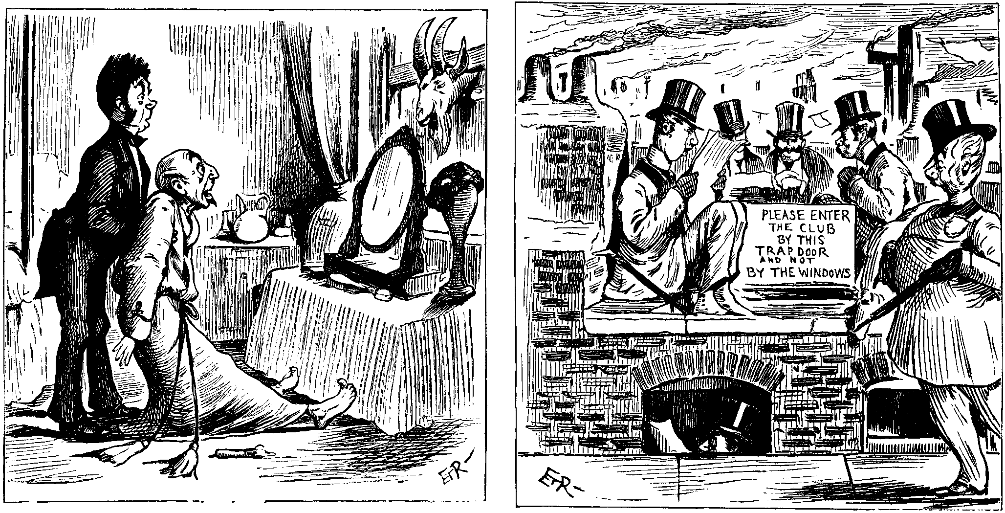 | SUDDEN APPEARANCE OF THE PICCADILLY GOAT TO ELDERLY GENTLEMAN, WHO IS QUIETLY DRESSING IN HIS ROOM ON SECOND FLOOR. | A CLUB ALMOST ENTIRELY DISAPPEARS. MEMBERS MAKE THE BEST OF THE SITUATION. |