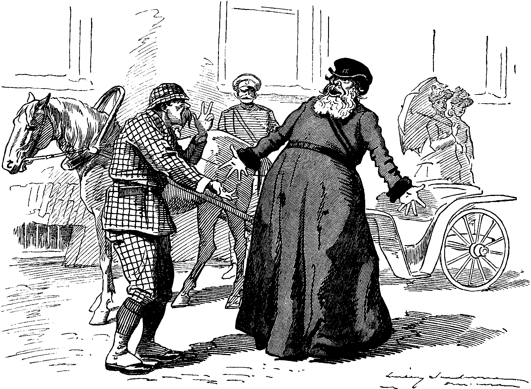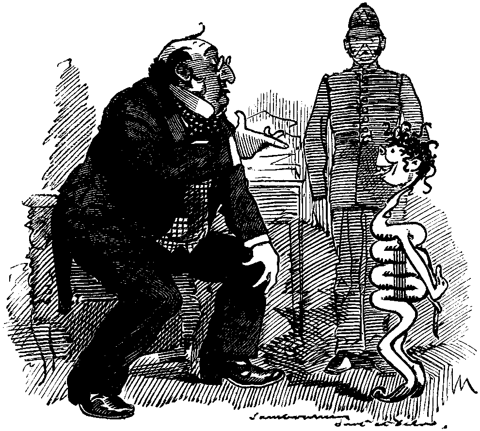 In fact, whenever a Purple Dragoon fell in love, the object of his affections immediately pretended to love someone else. Hard lines, but soldiers were born to suffer. It is so easy, so true, so usual to say, "there's another day to-morrow," but that never helped even a Purple Dragoon to worry through to-day any the quicker. Poor, brave, noble, drawling, manly, pipe-smoking fellows! On this particular occasion FOOTLES uttered only one word. It was short, and began with the fourth letter of the alphabet. But he may be pardoned, for some of the glowing embers from his magnificent briar-wood pipe had dropped on to his regulation overalls. The result was painful—to FOOTLES. All the others laughed as well as they could, with clays, meerschaums, briars, and asbestos pipes in their mouths. And through the thick cloud of scented smoke the mess-waiter came into the room, bearing in his hand a large registered letter, and coughing violently.
