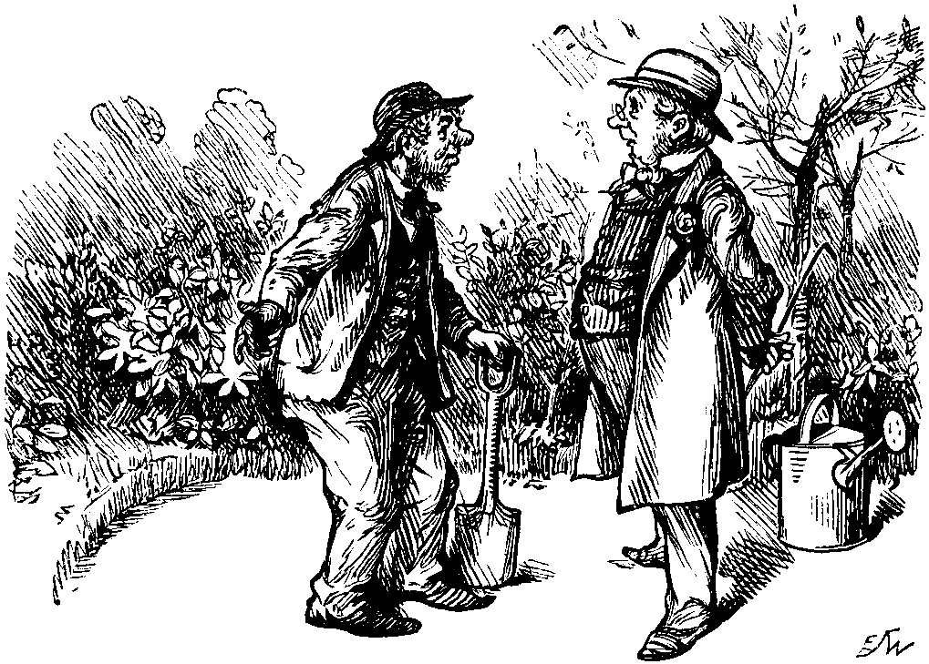 Take stroll in Park to collect my thoughts. Find two leading Belfast linen-merchants busily gathering up sawdust, &c, round tree I felled yesterday. They explain that they've [pg 219] been "much interested in my novel idea of converting chips of wood into best cambric pocket-handkerchiefs," and think that it beats General BOOTH's notion of making children's toys out of old sardine-tins hollow. I should rather think it did! Still, have to confess that I'm not ready at present to "quote them my wholesale price for best oak-shavings delivered free on rail."