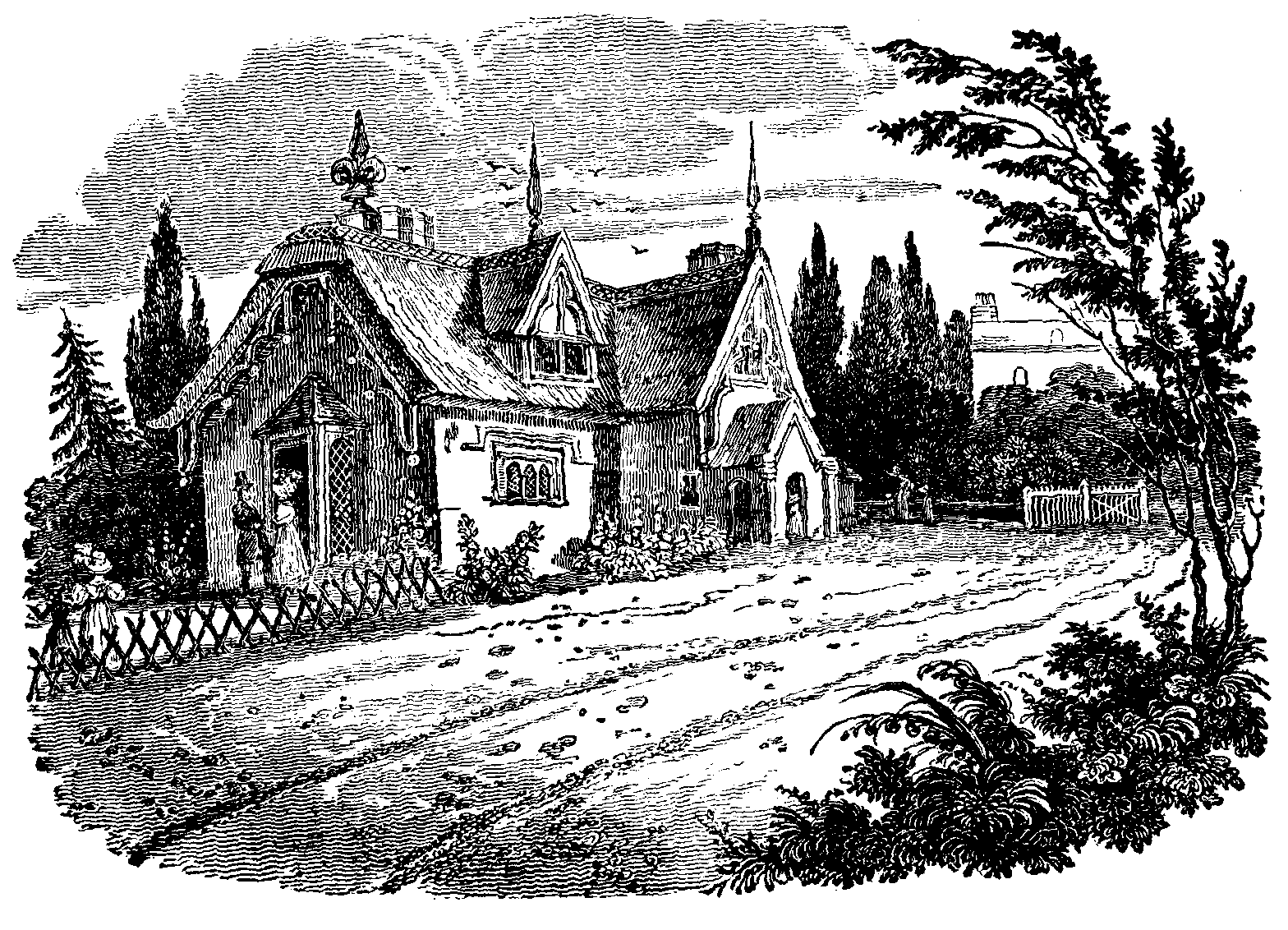 We entered the grounds at an elegant rustic lodge (see the Cut,) where commences a new carriage-road 3 to Croydon; which winds round the flank of the hill, and is protected by hanging woods. The lodge is in the best taste of ornate rusticity, with the characteristic varieties of gable, dripstone, portico, bay-window, and embellished chimney: of the latter there are some specimens in the best style of our olden architects. This building, as well as the other rural edifices in the grounds, and the whole disposal of the latter, have been planned by Mr. Decimus Burton, the originator of the architectural embellishments of the Zoological Gardens in the Regent's Park.