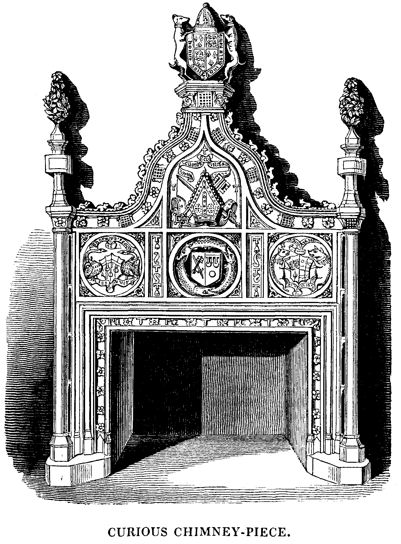 We select this Engraving as an illustration of the elaborate sculptural decoration employed in domestic architecture about three centuries since; but more particularly as a specimen of the embellishment of the ecclesiastical residences of that period. It represents a chimney-piece erected in the Bishop's palace at Exeter, by Peter Courtenay, who was consecrated Bishop of Exeter, A.D. 1477, and translated to Winchester, A.D. 1486. He had formerly been master of St. Antony's Hospital, in London.
