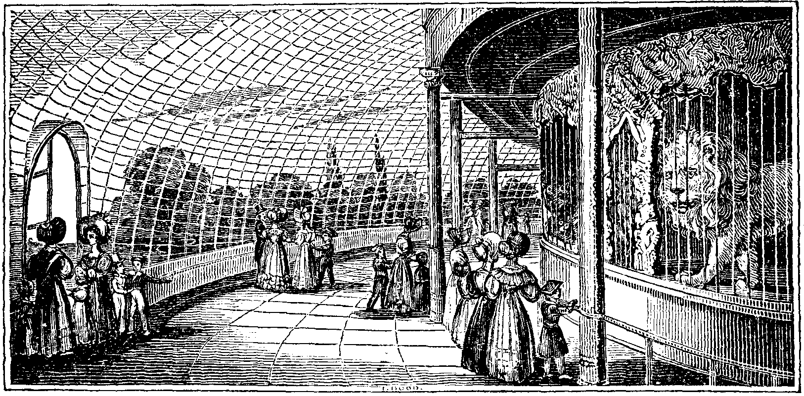 To the right is a semicircular glazed house containing many beautiful foreign birds, and two Boas, which, from their torpidity, appear nearly as harmless as their shaggy namesakes that encircle many a fair neck. The movable aviaries are too numerous to describe; but we must notice, in one of them, a fine pair of Great Crowned Pigeons from New Guinea; their front colour is a bright slate, as is that of their crests of fine silky feathers. We next pass the circular Confectionary room, and reach the curvilinear glazed building of 300 feet in diameter. (See the Cut.) This has been planned by Mr. Henry Phillips; of the execution we spoke in The Mirror, No. 528. There are four entrances to this well-contrived building. Immediately within the wall, and all throughout the circle, is a channel of water containing gold and silver fish; from the margin of which plants are to be trained up within the glass. Next is a circular range of seats, then a broad walk, and in the centre of the building are placed the cages of carnivorous quadrupeds, as Lions, Tigers, Leopards, Hyaenas, &c. The Lions are especially worth notice: they are African and Asiatic, and the contrast between a pair from the country of the Persian Gulf with their African neighbours, is very striking. A sleek Lynx from Persia, with its exquisite tufted ears, and a docile Puma, will receive the distant caresses of visiters. The fronts of the cages are ornamented with painted rock-work, and our artist has endeavoured to convey an idea of the lordly Lion in his embellished dwelling. The whole building is admirably ventilated.