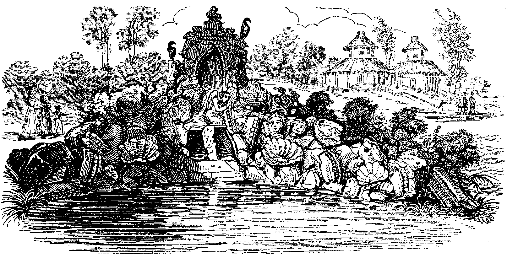 Next is an enclosure containing two pair of fine Pelicans, and the solitary kennels of an Alpine and Cuban Dog: the Armadillo house, with a pair of eight-banded inmates: near the latter a sty or cage is preparing for Porcupines. At this extremity of the grounds, is the Deer paddock, with about forty specimens, among which the Axis or spotted varieties are very beautiful. We now reach a picturesque group of rock-work, (See the third Cut), the lower part of which is intended for Beavers, the upper craigs being at present occupied by Vultures and Eagles. The rock-work consists chiefly of granite, with a few masses of the rock of Gibraltar.