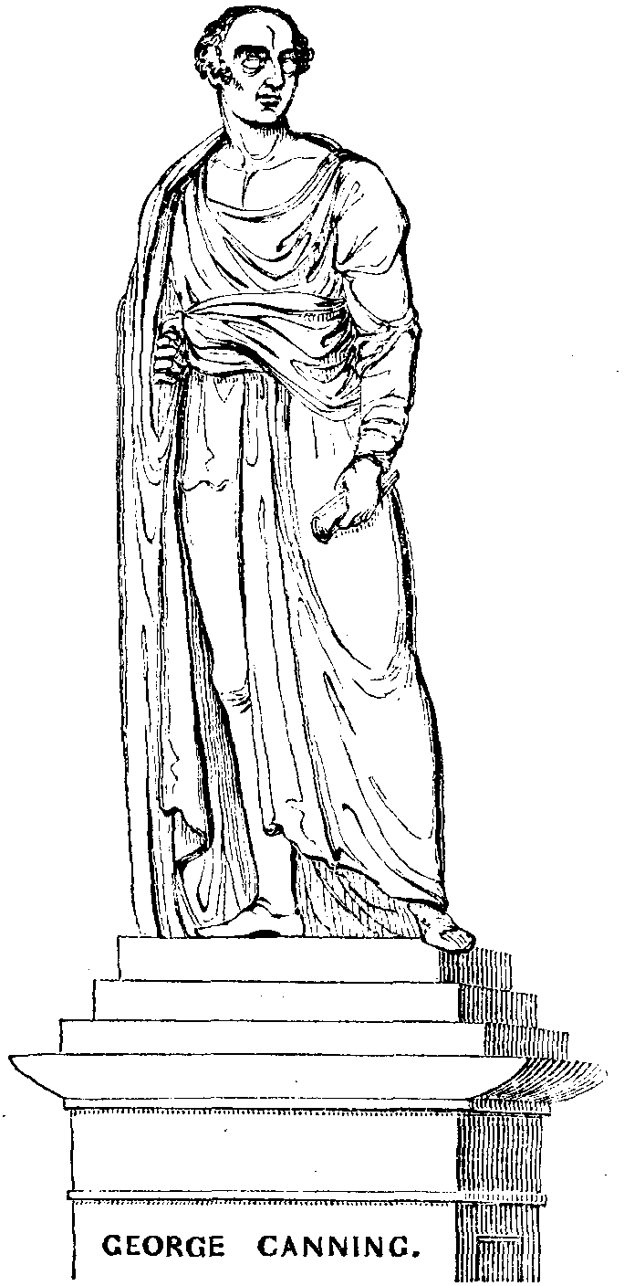 The situation of the statue has been judiciously chosen, being but a short distance from the senate wherein Canning built up his earthly fame. The association is unavoidable; and scores of patriotic men who pass by this national tribute to splendid talent may feel its inspiring influence. Still, rather than speculate upon Mr. Canning's political career, we quote Lord Byron's manly eulogium on the illustrious dead: "Canning," said Byron, in his usual energetic manner, "is a genius, almost an universal one, an orator, a wit, a poet, and a statesman." Again,