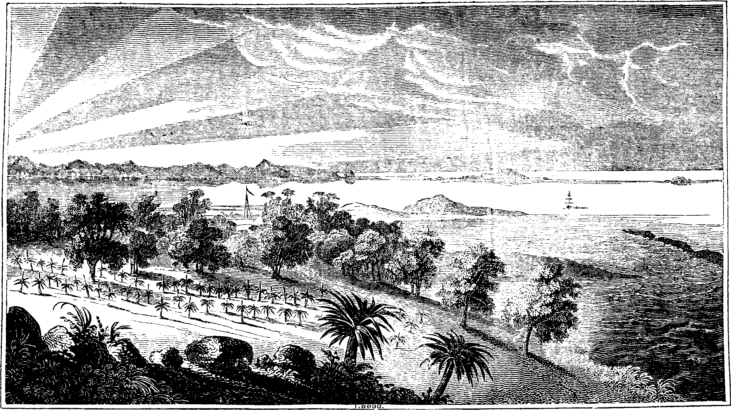 "A view in Western Australia, taken from a hill, the intended site of a Fort, on the left bank of the Swan River, a mile and a quarter from its mouth. The objects are, on the left, in the distance, Garden Island, that on the right of it Pulo Carnac; between the two is the only known entrance for shipping into Cockburn Sound, which lies between Garden Island and the main land; the anchorage being off the island. On the right is the mouth of the Swan River. On the left, a temporary mud work, overlooking a small bay where the troops disembarked. In the foreground tis a road leading to the intended fort and cantonment on the river."