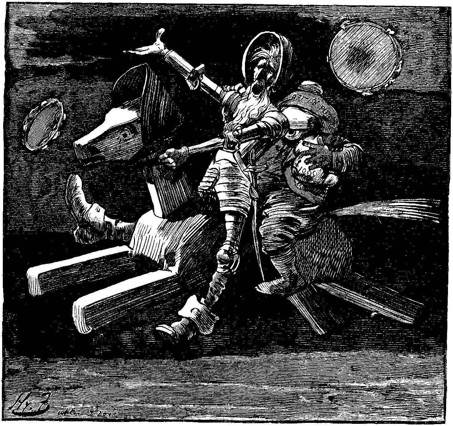 "Hoodwink thyself, Sancho," said Don Quixote, "and get up.... And supposing the success of the adventure should not be equal to our hopes, yet of the glory of so brave an attempt no malice can deprive us.... The whole company raised their voices at once, calling out, 'Speed you well, valorous Knight! heaven guide thee, undaunted Squire! Now you fly aloft!'"—Adventures of Don Quixote.]