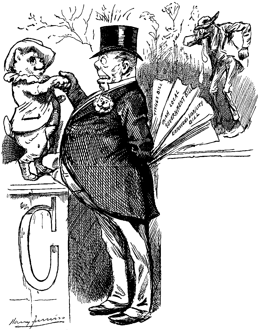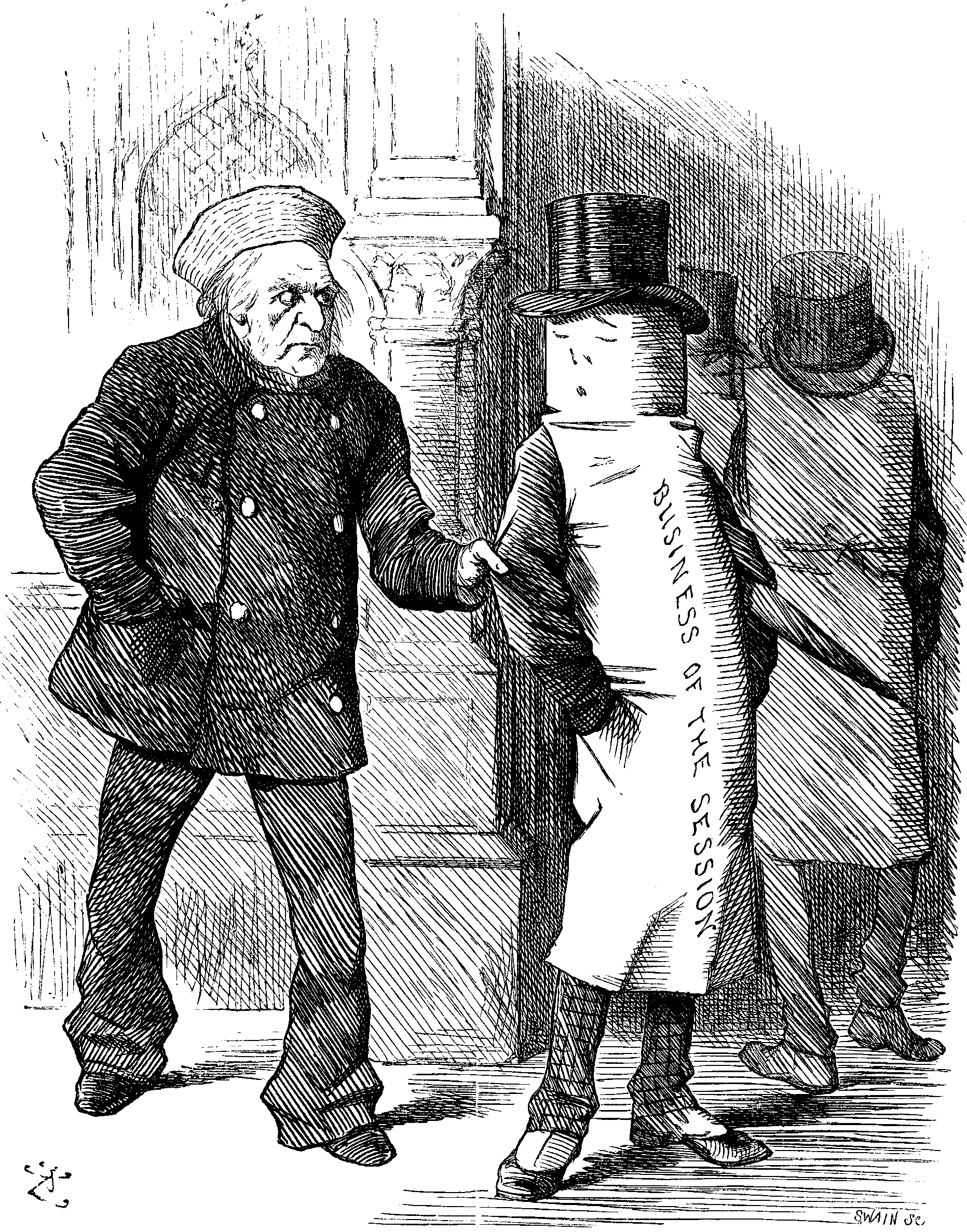 OLD MORALITY pretty lively in anticipation of Session, which opens to-morrow. Always inclined to take sanguine view of situation. Doesn't vary now. "Oh, you leave it to us, TOBY, dear boy." he said, when I expressed hope that he would not risk his precious life and health by overdoing it. "We've got a splendid programme, and mean to pull through every Bill. Didn't do much last year, it is true: but don't you see the advantage of that? If we'd passed all our Bills last Session, must have arranged a new programme this year, involving considerable labour. As it is we turn a handle, and there are all the old things once more; homely and friendly; as the poet says, 'All, all, are come, the old familiar faces.' There's the Irish Local Government Bill, the Tithes Bill, Employers' Liability, and a troop of others. All been brought in before; everybody knows about them; if we don't pass them this Session they must come up again next."