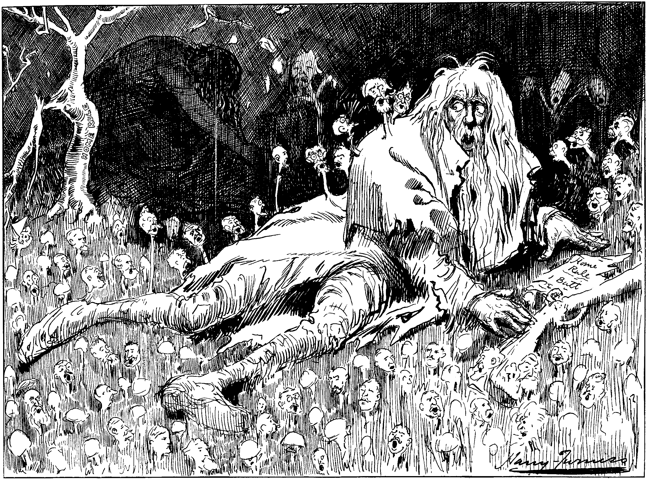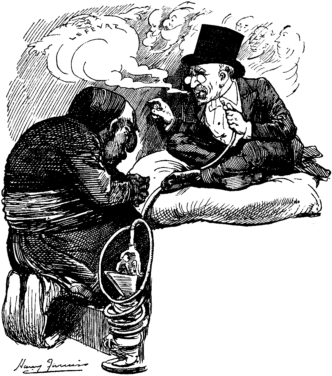 The Aunt (still quoting). "In the famous work," BOBBY, "by which we know MASÛDI, he mentions the Persian Hezar Afsane-um-um-um,—nor have commentators failed to notice that the occasion of the book written for the Princess HOMAI resembles the story told in the Hebrew Bible about ESTHER, her mother or grandmother, by some Persian Jew two or three centuries B.C." Well, I never knew that before!... This is "Sindbad and the Old Man of the Sea"—let's see what they say about him. (Reads.) "Both the story of Sindbad and the old Basque legend of Tartaro are undoubtedly borrowed from the Odyssey of HOMER, whose Iliad and Odyssey were translated into Syriac in the reign of HARUN-UR-RASHID." Dear, dear, how interesting, now! and, BOBBY, what do you think someone says about "Jack and the Beanstalk"? He says—"this tale is an allegory of the Teutonic Al-fader, the red hen representing the all-producing sun: the moneybags, the fertilising rain; and the harp, the winds." Well, I'm sure it seems likely enough, doesn't it?