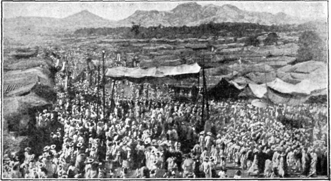 The next day we reached the Corean port of Fusan. I well remember how much I was struck when we entered the pretty harbour and approached the spot where we cast anchor, by the sight of hundreds of white spots moving slowly along the coast and on a road winding up a hill. As we drew nearer, the white spots became larger and assumed more and more the form of human beings. There was something so ghostly about that scene that it is still vividly impressed upon my mind.