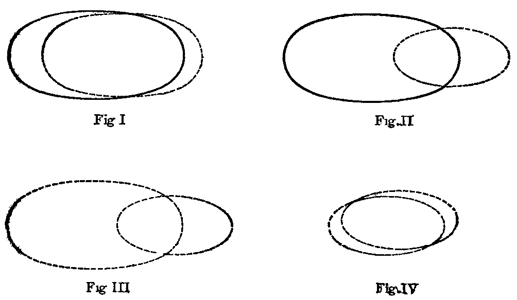 In Fig. I the heavy-lined ellipse represents the formal diction of Cicero, the dotted line ellipse his conversational vocabulary. They overlap each other through a great part of their extent, but there are certain literary locutions which would rarely be used by him in conversation, and certain colloquial words and phrases which he would not use in formal writing. Therefore the two ellipses would not be coterminous. In Fig. II the heavy ellipse has the same meaning as in Fig. I, while the space enclosed by the dotted line represents the vocabulary of an uneducated Roman, which would be much smaller than that of Cicero and would show a greater degree of difference from the literary vocabulary than Cicero's conversational stock of words does. The relation of the uncultivated Roman's conversational vocabulary to that of Cicero is illustrated in Fig. III, while Fig. IV shows how the Latin of the average man in Rome would compare, for instance, with that of a resident of Lugudunum, in Gaul.