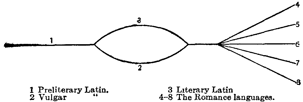 As for popular Latin, it has never ceased to exist. It is the language of France, Spain, Italy, Roumania, and all the Romance countries to-day. Its history has been unbroken from the founding of Rome to the present time. Various scholars have tried to determine the date before which we shall call the popular speech vulgar Latin, and after which it may better be styled French or Spanish or Italian, as the case may be. Some would fix the dividing line in the early part of the eighth century A.D., when phonetic changes common to all parts of the Roman world would cease to occur. Others would fix it at different periods between the middle of the sixth to the middle of the seventh century, according as each section of the old Roman world passed definitely under the control of its Germanic invaders. The historical relations of literary and colloquial Latin would be roughly indicated by the accompanying diagram, in which preliterary Latin divides, on the appearance of literature in the third century B.C., into popular Latin and literary Latin. These two forms of speech develop along independent lines until, in the sixth century, literary Latin is merged in popular Latin and disappears. The unity for the Latin tongue thus secured was short lived, because within a century the differentiation begins which gives rise to the present-day Romance languages.
