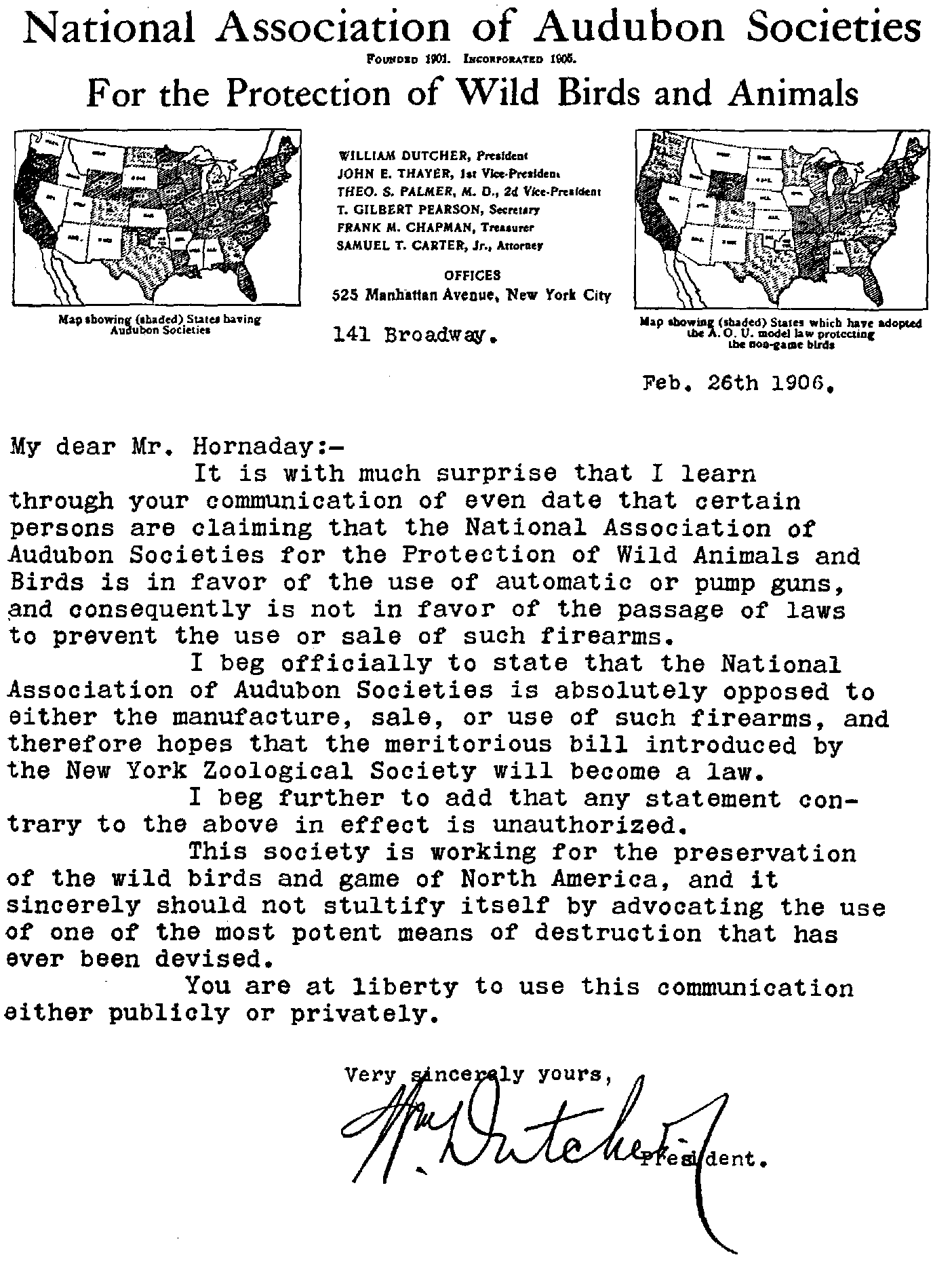 I have been a sportsman myself; but times have changed, and we must change also. When game was plentiful, I believed that it was right for men and boys to kill a limited amount of it for sport and for the table. But the old basis has been swept away by an Army of Destruction that now is almost beyond all control. We must awake, and arouse to the new situation, face it like men, and adjust our minds to the new conditions. The three million gunners of to-day must no longer expect or demand the same generous hunting privileges that were right for hunters fifty years ago, when game was fifty times as plentiful as it is now and there was only one killer for every fifty now in the field.
